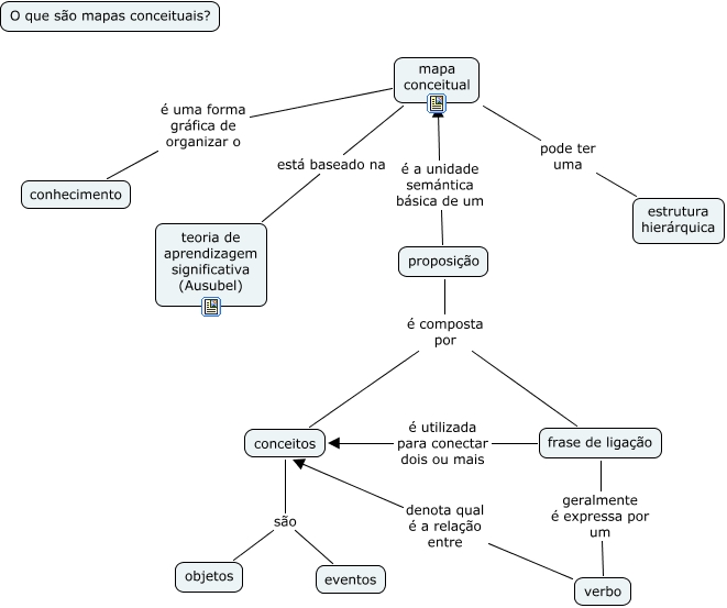 Este Cmap, tiene información relacionada con: mapa, frase de ligação é utilizada para conectar dois ou mais conceitos, mapa conceitual é uma forma gráfica de organizar o conhecimento, conceitos são eventos, frase de ligação geralmente é expressa por um verbo, mapa conceitual está baseado na teoria de aprendizagem significativa (Ausubel), proposição é composta por conceitos, conceitos são objetos, mapa conceitual pode ter uma estrutura hierárquica, verbo denota qual é a relação entre conceitos, proposição é composta por frase de ligação