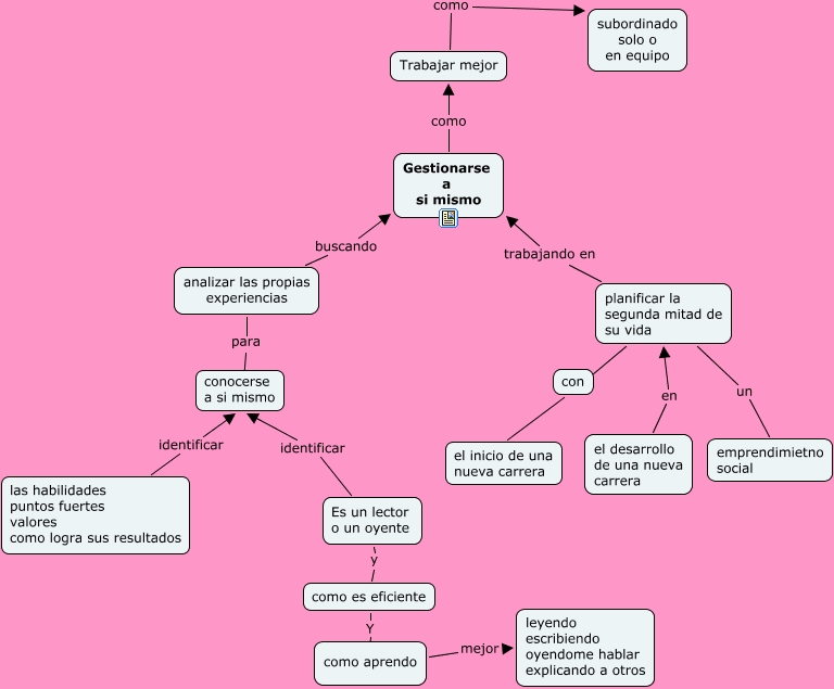 Este Cmap, tiene información relacionada con: gestión de la persona, el desarrollo de una nueva carrera en planificar la segunda mitad de su vida, como es eficiente Y ????, analizar las propias experiencias buscando Gestionarse a si mismo, planificar la segunda mitad de su vida un emprendimietno social, Gestionarse a si mismo como Trabajar mejor, Es un lector o un oyente y como es eficiente, planificar la segunda mitad de su vida ???? el inicio de una nueva carrera, las habilidades puntos fuertes valores como logra sus resultados identificar conocerse a si mismo, planificar la segunda mitad de su vida trabajando en Gestionarse a si mismo, Es un lector o un oyente identificar conocerse a si mismo, Trabajar mejor como subordinado solo o en equipo, analizar las propias experiencias para ????, como aprendo mejor leyendo escribiendo oyendome hablar explicando a otros