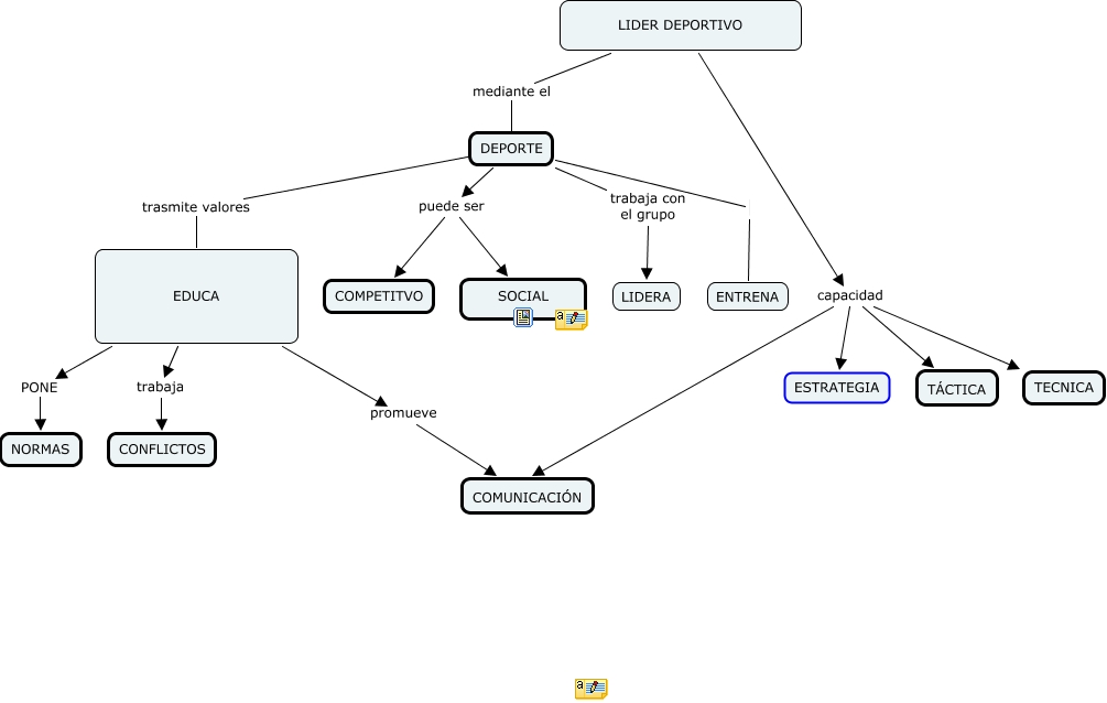 Este Cmap, tiene información relacionada con: Deporte Social, LIDER DEPORTIVO mediante el DEPORTE, DEPORTE puede ser SOCIAL, EDUCA trabaja CONFLICTOS, LIDER DEPORTIVO capacidad TECNICA, LIDER DEPORTIVO capacidad ESTRATEGIA, DEPORTE puede ser COMPETITVO, LIDER DEPORTIVO capacidad COMUNICACIÓN, DEPORTE ENTRENA, DEPORTE trasmite valores EDUCA, DEPORTE trabaja con el grupo LIDERA, EDUCA PONE NORMAS, LIDER DEPORTIVO capacidad TÁCTICA, EDUCA promueve COMUNICACIÓN