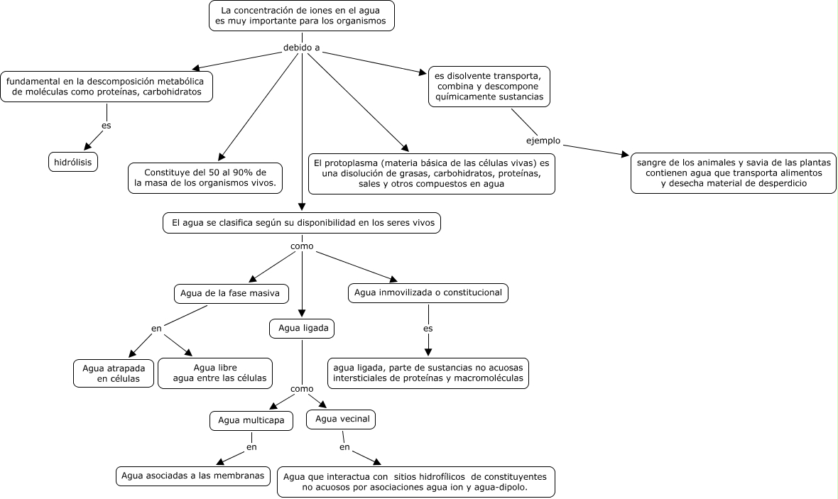 Este Cmap, tiene información relacionada con: importancia del agua para los seres vivos, El agua se clasifica según su disponibilidad en los seres vivos como Agua de la fase masiva, es disolvente transporta, combina y descompone químicamente sustancias ejemplo sangre de los animales y savia de las plantas contienen agua que transporta alimentos y desecha material de desperdicio, La concentración de iones en el agua es muy importante para los organismos debido a El protoplasma (materia básica de las células vivas) es una disolución de grasas, carbohidratos, proteínas, sales y otros compuestos en agua, Agua inmovilizada o constitucional es agua ligada, parte de sustancias no acuosas intersticiales de proteínas y macromoléculas, Agua ligada como Agua multicapa, El agua se clasifica según su disponibilidad en los seres vivos como Agua ligada, La concentración de iones en el agua es muy importante para los organismos debido a El agua se clasifica según su disponibilidad en los seres vivos, La concentración de iones en el agua es muy importante para los organismos debido a Constituye del 50 al 90% de la masa de los organismos vivos., Agua de la fase masiva en Agua libre agua entre las células, fundamental en la descomposición metabólica de moléculas como proteínas, carbohidratos es hidrólisis, Agua ligada como Agua vecinal, Agua de la fase masiva en Agua atrapada en células, La concentración de iones en el agua es muy importante para los organismos debido a es disolvente transporta, combina y descompone químicamente sustancias, La concentración de iones en el agua es muy importante para los organismos debido a fundamental en la descomposición metabólica de moléculas como proteínas, carbohidratos, El agua se clasifica según su disponibilidad en los seres vivos como Agua inmovilizada o constitucional, Agua multicapa en Agua asociadas a las membranas, Agua vecinal en Agua que interactua con sitios hidrofílicos de constituyentes no acuosos por asociaciones agua ion y agua-dipolo.