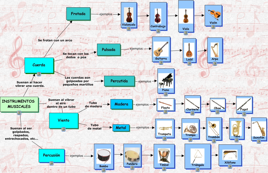 Este Cmap, tiene información relacionada con: Instrumentos musicales Isabel Castillo Benítez, Clarinete ???? Oboe, Percutida ejemplos Piano, Pandero ???? Timbal, Cuerda Se tocan con los dedos o púa Pulsada, Contrabajo ???? Viola, Oboe ???? Fagot, Cuerda Se frotan con un arco Frotada, Metal ejemplos Trompeta, Flauta ???? Clarinete, Timbal ???? Triángulo, Cuerda Las cuerdas son golpeadas por pequeños martillos Percutida, Trompa ???? Trombón, Madera ejemplos Flauta, Laúd ???? Arpa, Pulsada ejemplos Guitarra, Guitarra ???? Laúd, INSTRUMENTOS MUSICALES Suenan al hacer vibrar una cuerda. Cuerda, Frotada ejemplos Violoncelo, INSTRUMENTOS MUSICALES Suenan al ser golpèados, raspados, entrechocados, etc... Percusión, Trombón ???? Tuba