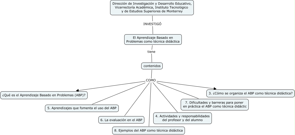 Este Cmap, tiene información relacionada con: 1, contenidos COMO 6. La evaluación en el ABP, contenidos COMO 3. ¿Cómo se organiza el ABP como técnica didáctica?, El Aprendizaje Basado en Problemas como técnica didáctica tiene contenidos, contenidos COMO 7. Dificultades y barreras para poner en práctica el ABP como técnica didáctic, contenidos COMO ¿Qué es el Aprendizaje Basado en Problemas (ABP)?, contenidos COMO 8. Ejemplos del ABP como técnica didáctica, Dirección de Investigación y Desarrollo Educativo, Vicerrectoría Académica, Instituto Tecnológico y de Estudios Superiores de Monterrey INVESTIGÓ El Aprendizaje Basado en Problemas como técnica didáctica, contenidos COMO 4. Actividades y responsabilidades del profesor y del alumno, contenidos COMO 5. Aprendizajes que fomenta el uso del ABP