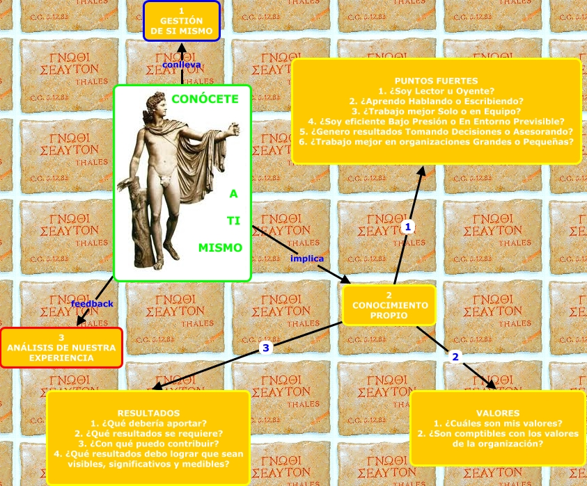 Este Cmap, tiene información relacionada con: gestion de uno mismo, CONÓCETE A TI MISMO feedback 3 ANÁLISIS DE NUESTRA EXPERIENCIA, CONÓCETE A TI MISMO conlleva 1 GESTIÓN DE SI MISMO, 2 CONOCIMIENTO PROPIO 3 RESULTADOS 1. ¿Qué debería aportar? 2. ¿Qué resultados se requiere? 3. ¿Con qué puedo contribuir? 4. ¿Qué resultados debo lograr que sean visibles, significativos y medibles?, 2 CONOCIMIENTO PROPIO 2 VALORES 1. ¿Cuáles son mis valores? 2. ¿Son comptibles con los valores de la organización?, CONÓCETE A TI MISMO implica 2 CONOCIMIENTO PROPIO, 2 CONOCIMIENTO PROPIO 1 PUNTOS FUERTES 1. ¿Soy Lector u Oyente? 2. ¿Aprendo Hablando o Escribiendo? 3. ¿Trabajo mejor Solo o en Equipo? 4. ¿Soy eficiente Bajo Presión o En Entorno Previsible? 5. ¿Genero resultados Tomando Decisiones o Asesorando? 6. ¿Trabajo mejor en organizaciones Grandes o Pequeñas?