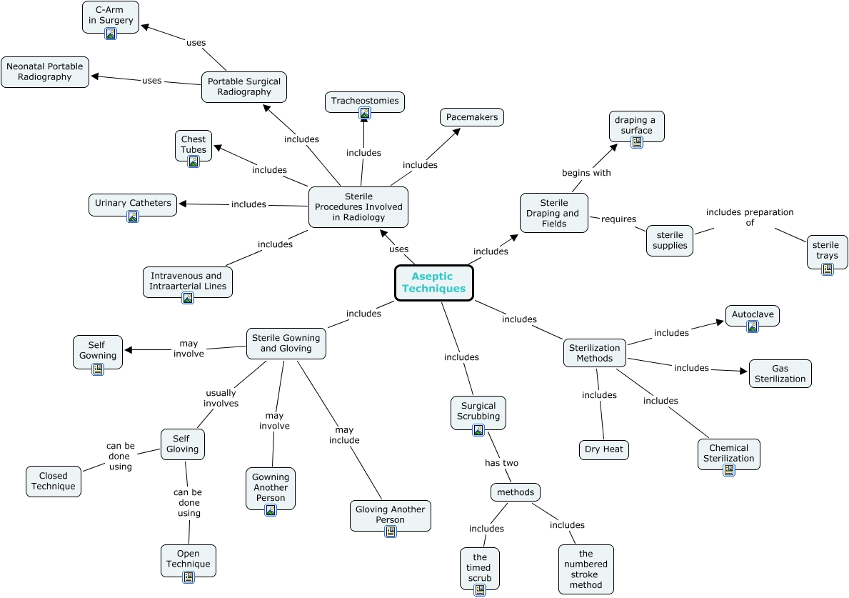 This Concept Map, created with IHMC CmapTools, has information related to: aseptic techniques, Sterile Procedures Involved in Radiology includes Urinary Catheters, Aseptic Techniques includes Sterile Draping and Fields, methods includes the numbered stroke method, Sterilization Methods includes Autoclave, Aseptic Techniques uses Sterile Procedures Involved in Radiology, Aseptic Techniques includes Sterile Gowning and Gloving, Sterile Gowning and Gloving may involve Self Gowning, Portable Surgical Radiography uses C-Arm in Surgery, Sterile Gowning and Gloving may involve Gowning Another Person, Aseptic Techniques includes Sterilization Methods, Sterile Procedures Involved in Radiology includes Intravenous and Intraarterial Lines, Sterile Gowning and Gloving may include Gloving Another Person, Self Gloving can be done using Closed Technique, Sterile Procedures Involved in Radiology includes Chest Tubes, Sterile Gowning and Gloving usually involves Self Gloving, Portable Surgical Radiography uses Neonatal Portable Radiography, Sterilization Methods includes Gas Sterilization, Sterile Draping and Fields begins with draping a surface, Sterile Procedures Involved in Radiology includes Tracheostomies, Self Gloving can be done using Open Technique