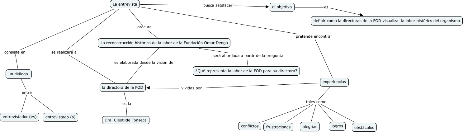 Entrevista Fundación Omar Dengo, La reconstrucción histórica de la labor de la Fundación Omar Dengo será abordada a partir de la pregunta ¿Qué representa la labor de la FOD para su directora?, experiencias tales como conflictos, La entrevista procura La reconstrucción histórica de la labor de la Fundación Omar Dengo, La reconstrucción histórica de la labor de la Fundación Omar Dengo es elaborada desde la visión de la directora de la FOD, experiencias tales como obstáculos, la directora de la FOD es la Dra. Cleotilde Fonseca, experiencias tales como alegrías, La entrevista consiste en un diálogo, La entrevista busca satsfacer el objetivo, experiencias tales como logros