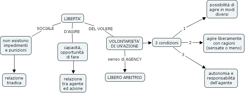 Libertà gruppo 3 (1° schema), non esistono impedimenti e punizioni ???? relazione triadica, capacità, opportunità di fare ???? relazione tra agente ed azione, LIBERTA' SOCIALE non esistono impedimenti e punizioni, 3 condizioni 2 agire liberamente con ragioni (sensate o meno), LIBERTA' D'AGIRE capacità, opportunità di fare, LIBERTA' DEL VOLERE VOLONTARIETA' DI UN'AZIONE, VOLONTARIETA' DI UN'AZIONE ???? 3 condizioni, 3 condizioni 3 autonomia e responsabilità dell'agente, LIBERTA' DEL VOLERE VOLONTARIETA' DI UN'AZIONE, 3 condizioni 1 possibilità di agire in modi diversi