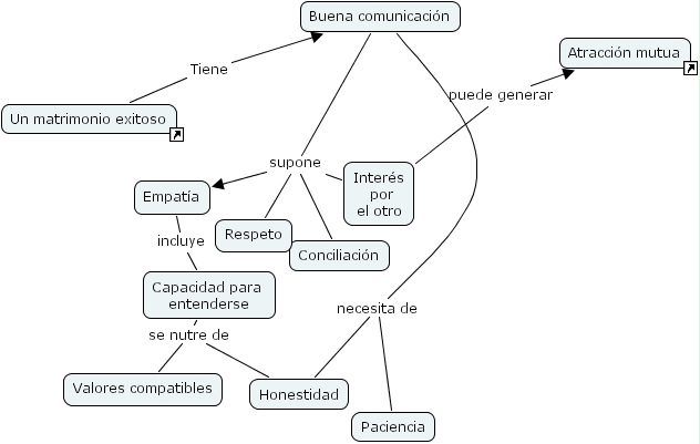 Buena comunicaci�n supone Respeto, Buena comunicaci�n supone Empat�a, Buena comunicaci�n supone Inter�s por el otro, Buena comunicaci�n supone Conciliaci�n, Un matrimonio exitoso Tiene Buena comunicaci�n, Empat�a incluye Capacidad para entenderse, Inter�s por el otro puede generar Atracci�n mutua, Buena comunicaci�n necesita de Paciencia, Buena comunicaci�n necesita de Honestidad, Capacidad para entenderse se nutre de Honestidad, Capacidad para entenderse se nutre de Valores compatibles
