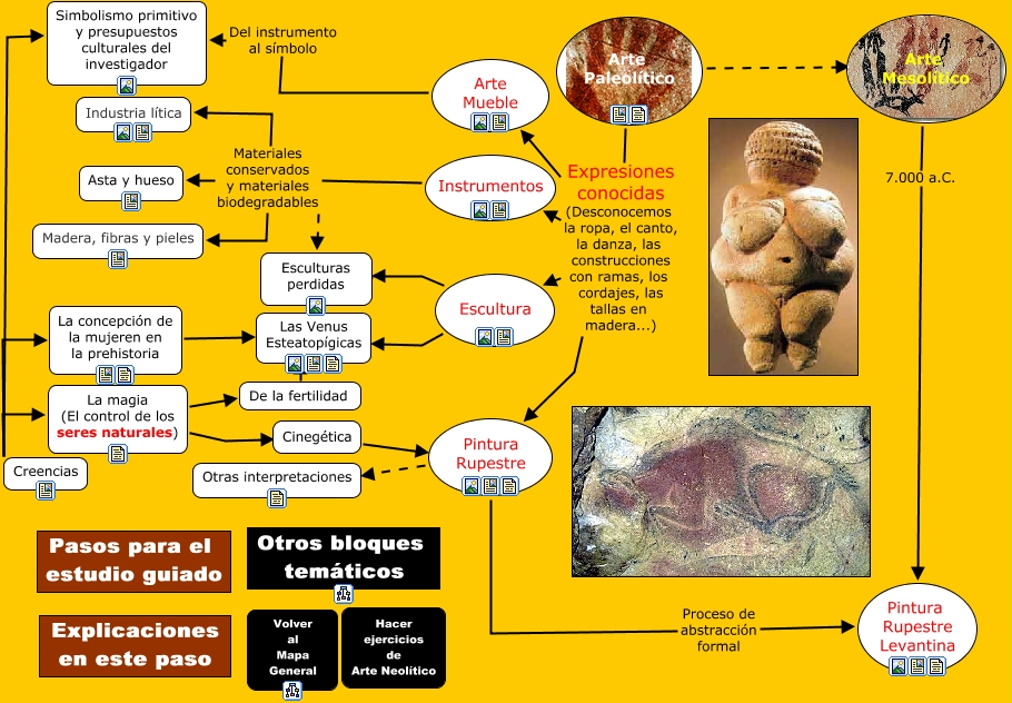 Arte Paleolítico, Instrumentos Materiales conservados y materiales biodegradables Madera, fibras y pieles, Creencias ???? Simbolismo primitivo y presupuestos culturales del investigador, Pintura Rupestre Proceso de abstracción formal Pintura Rupestre Levantina, Instrumentos Materiales conservados y materiales biodegradables Esculturas perdidas, Arte Paleolítico Expresiones conocidas (Desconocemos la ropa, el canto, la danza, las construcciones con ramas, los cordajes, las tallas en madera...) Pintura Rupestre, Arte Paleolítico ???? Arte Mesolítico, Arte Paleolítico Expresiones conocidas (Desconocemos la ropa, el canto, la danza, las construcciones con ramas, los cordajes, las tallas en madera...) Escultura, Creencias ???? La magia (El control de los seres naturales), Cinegética ???? Pintura Rupestre, Instrumentos Materiales conservados y materiales biodegradables Industria lítica