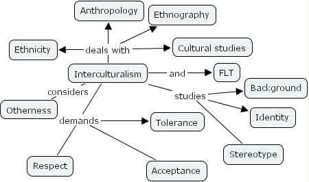 Interculturalism deals with Ethnicity, Interculturalism deals with Ethnography, Interculturalism deals with Cultural studies, Interculturalism deals with Anthropology, Interculturalism considers Otherness, Interculturalism demands Acceptance, Interculturalism demands Tolerance, Interculturalism demands Respect, Interculturalism studies Identity, Interculturalism studies Background, Interculturalism studies Stereotype, Interculturalism and FLT
