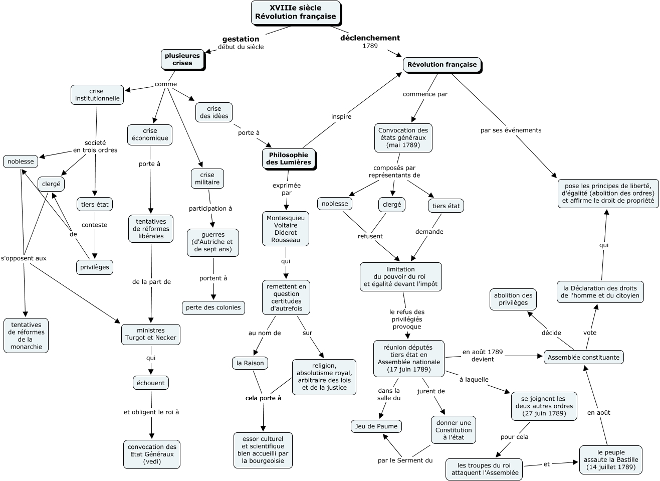 Révolution française (gestation et déclenchement), privilèges de noblesse, crise des idèes porte à Philosophie des Lumières, échouent et obligent le roi à convocation des Etat Généraux (vedi), guerres (d'Autriche et de sept ans) portent à perte des colonies, clergé refusent limitation du pouvoir du roi et égalité devant l'impôt, religion, absolutisme royal, arbitraire des lois et de la justice cela porte à essor culturel et scientifique bien accueilli par la bourgeoisie, réunion députés tiers état en Assemblée nationale (17 juin 1789) à laquelle se joignent les deux autres ordres (27 juin 1789), le peuple assaute la Bastille (14 juillet 1789) en août Assemblée constituante, Convocation des états généraux (mai 1789) composés par représentants de tiers état, remettent en question certitudes d'autrefois sur religion, absolutisme royal, arbitraire des lois et de la justice