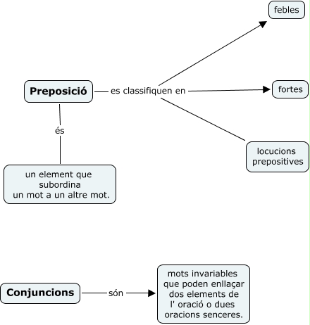 Aquest mapa conceptual conté informació relacionada amb: Preposició-Conjunció, Preposició es classifiquen en febles, Preposició es classifiquen en fortes, Preposició es classifiquen en locucions prepositives, Preposició és un element que subordina un mot a un altre mot., Conjuncions són mots invariables que poden enllaçar dos elements de l' oració o dues oracions senceres.