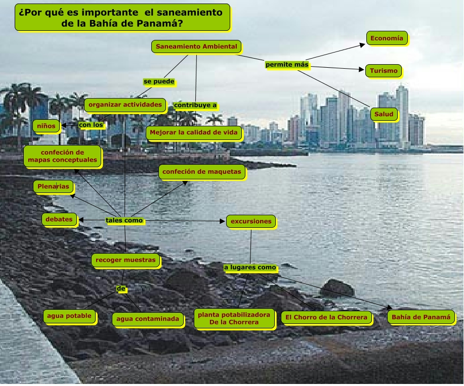 Saneamiento de la bahía de Panamá, organizar actividades con los niños, organizar actividades tales como debates, organizar actividades tales como confeción de maquetas, Saneamiento Ambiental se puede organizar actividades, excursiones a lugares como planta potabilizadora De la Chorrera, Saneamiento Ambiental contribuye a Mejorar la calidad de vida, Saneamiento Ambiental permite más Turismo, organizar actividades tales como recoger muestras, Saneamiento Ambiental permite más Economía, Saneamiento Ambiental permite más Salud