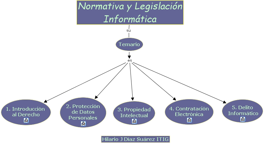 Temario es 4. Contrataci�n Electr�nica, Temario es 3. Propiedad Intelectual, Temario es 5. Delito Inform�tico, Temario es 1. Introducci�n al Derecho, Temario es 2. Protecci�n de Datos Personales, Normativa y Legislaci�n Inform�tica su Temario