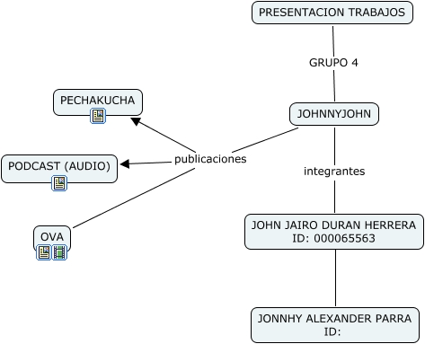 Este Cmap, tiene información relacionada con: JOHNNYJOHN, JOHNNYJOHN publicaciones OVA, JOHNNYJOHN integrantes JOHN JAIRO DURAN HERRERA ID: 000065563, JOHNNYJOHN publicaciones PECHAKUCHA, JOHNNYJOHN publicaciones PODCAST (AUDIO), JOHN JAIRO DURAN HERRERA ID: 000065563 ???? JONNHY ALEXANDER PARRA ID:, PRESENTACION TRABAJOS GRUPO 4 JOHNNYJOHN