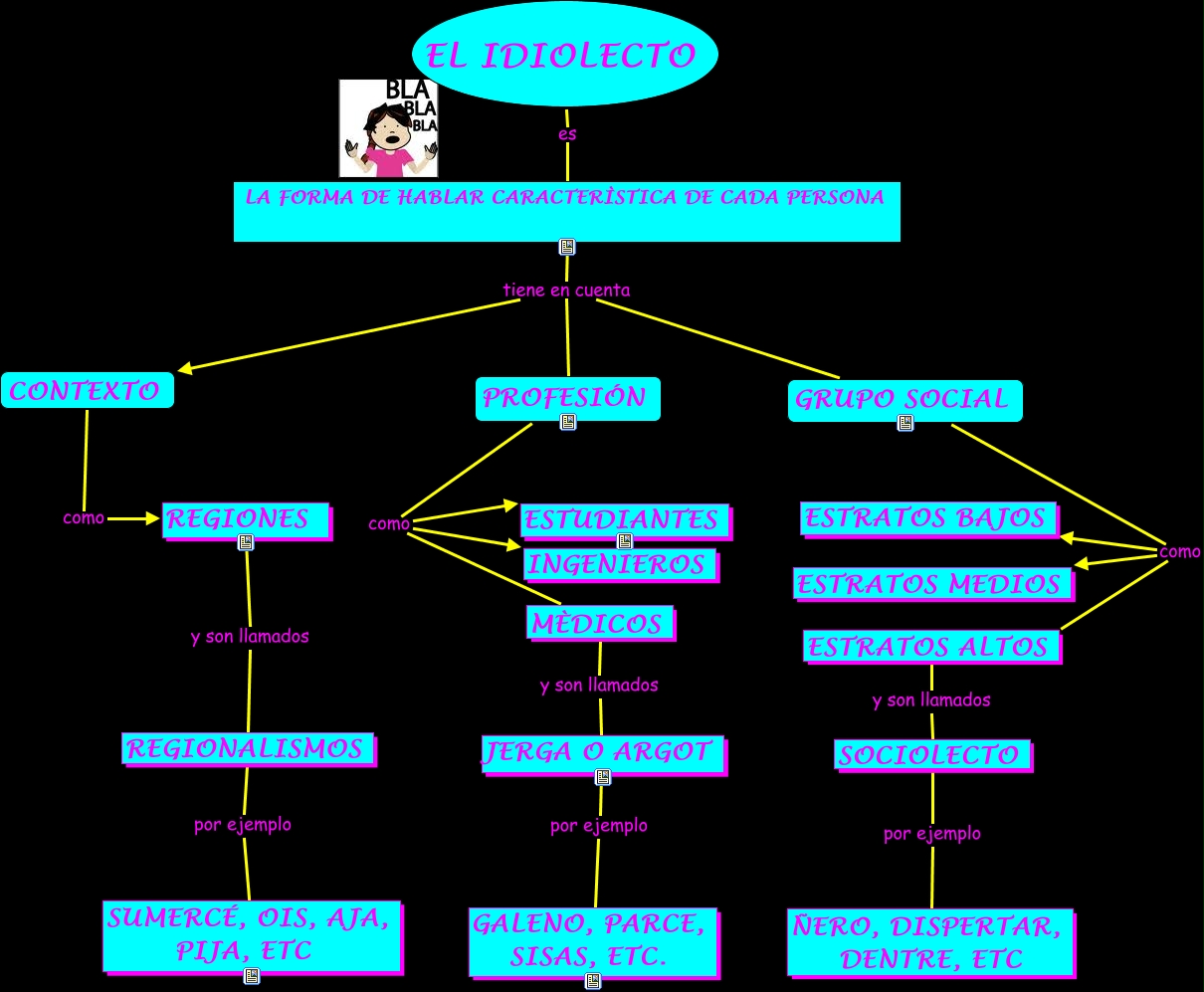 Este Cmap, tiene información relacionada con: El idiolecto, ESTRATOS ALTOS y son llamados SOCIOLECTO, REGIONALISMOS por ejemplo SUMERCÉ, OIS, AJA, PIJA, ETC, REGIONES y son llamados REGIONALISMOS, LA FORMA DE HABLAR CARACTERÌSTICA DE CADA PERSONA tiene en cuenta PROFESIÓN, PROFESIÓN como MÈDICOS, MÈDICOS y son llamados JERGA O ARGOT, EL IDIOLECTO es LA FORMA DE HABLAR CARACTERÌSTICA DE CADA PERSONA, LA FORMA DE HABLAR CARACTERÌSTICA DE CADA PERSONA tiene en cuenta CONTEXTO, PROFESIÓN como ESTUDIANTES, LA FORMA DE HABLAR CARACTERÌSTICA DE CADA PERSONA tiene en cuenta GRUPO SOCIAL, GRUPO SOCIAL como ESTRATOS BAJOS, JERGA O ARGOT por ejemplo GALENO, PARCE, SISAS, ETC., GRUPO SOCIAL como ESTRATOS ALTOS, SOCIOLECTO por ejemplo ÑERO, DISPERTAR, DENTRE, ETC, PROFESIÓN como INGENIEROS, GRUPO SOCIAL como ESTRATOS MEDIOS, CONTEXTO como REGIONES