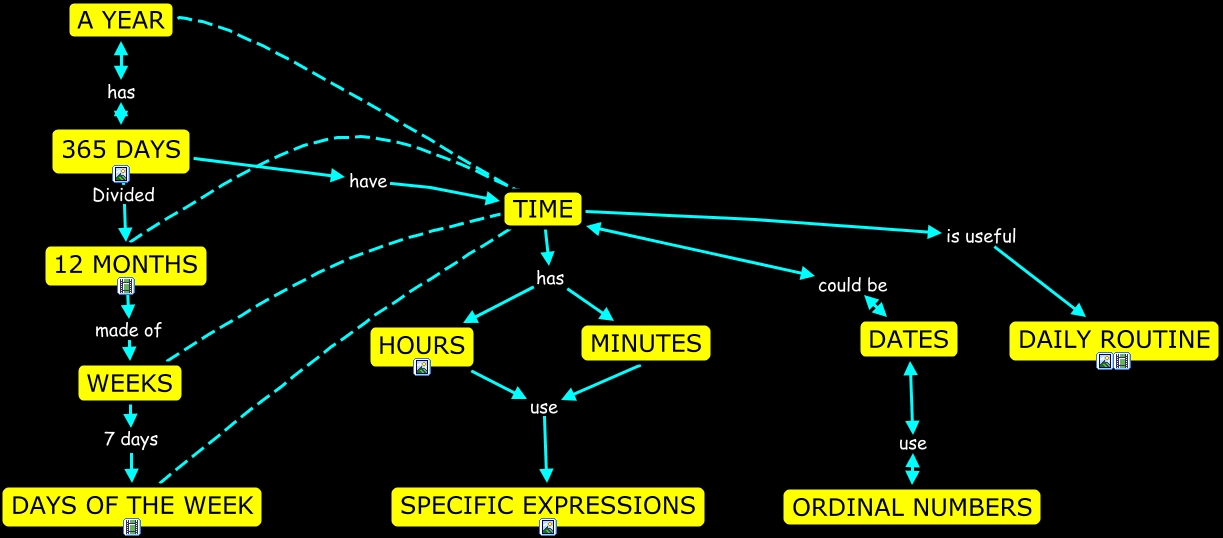 Este Cmap, tiene información relacionada con: 5TH GRADE, 365 DAYS Divided 12 MONTHS, DAYS OF THE WEEK ???? TIME, DATES use ORDINAL NUMBERS, HOURS use SPECIFIC EXPRESSIONS, TIME is useful DAILY ROUTINE, WEEKS ???? TIME, 365 DAYS have TIME, TIME has MINUTES, WEEKS 7 days DAYS OF THE WEEK, A YEAR has 365 DAYS, 12 MONTHS made of WEEKS, A YEAR ???? TIME, TIME could be DATES, TIME has HOURS, 12 MONTHS ???? TIME, MINUTES use SPECIFIC EXPRESSIONS