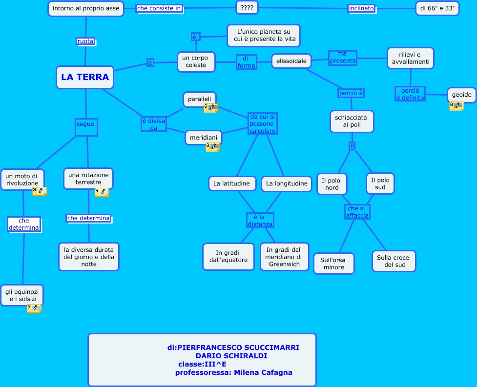 Questa Cmap, creata con IHMC CmapTools, contiene informazioni relative a: LA TERRA DI PIERFRANCESCO E DARIO, un corpo celeste di forma elissoidale, LA TERRA è divisa da meridiani, La longitudine è la distanza In gradi dal meridiano di Greenwich, elissoidale ma presenta rilievi e avvallamenti, Il polo sud il Il polo nord, LA TERRA è divisa da paralleli, LA TERRA ruota intorno al proprio asse, meridiani da cui si possono calcolare La latitudine, intorno al proprio asse che consiste in ????, un corpo celeste è L'unico pianeta su cui è presente la vita, paralleli da cui si possono calcolare La latitudine, LA TERRA segue un moto di rivoluzione, LA TERRA è un corpo celeste, Il polo sud che si affaccia Sulla croce del sud, ???? inclinato di 66° e 33', rilievi e avvallamenti perciò è definito geoide, La longitudine è la distanza In gradi dall'equatore, Il polo nord che si affaccia Sull'orsa minore, meridiani da cui si possono calcolare La longitudine, La latitudine è la distanza In gradi dal meridiano di Greenwich