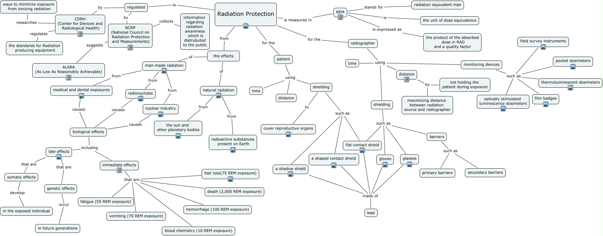This Concept Map, created with IHMC CmapTools, has information related to: Radiation Protection, hair loss(75 REM exposure) that are vomiting (70 REM exposure), shielding such as a shadow shield, a shaped contact shield made of lead, natural radiation from radioactive substances present on Earth, immediate effects that are blood chemistry (10 REM exposure), natural radiation from the sun and other planetary bodies, fatigue (55 REM exposure) that are blood chemistry (10 REM exposure), distance by maximizing distance between radiation source and radiographer, hemorrhage (100 REM exposure) that are vomiting (70 REM exposure), barriers such as primary barriers, radionuclides causes biological effects, Radiation Protection for the patient, shielding such as a shaped contact shield, barriers such as flat contact shield, regulated by CDRH (Center for Devices and Radiological Health), fatigue (55 REM exposure) that are vomiting (70 REM exposure), somatic effects develop in the exposed individual, hemorrhage (100 REM exposure) that are blood chemistry (10 REM exposure), glasses made of lead, man-made radiation from nuclear industry