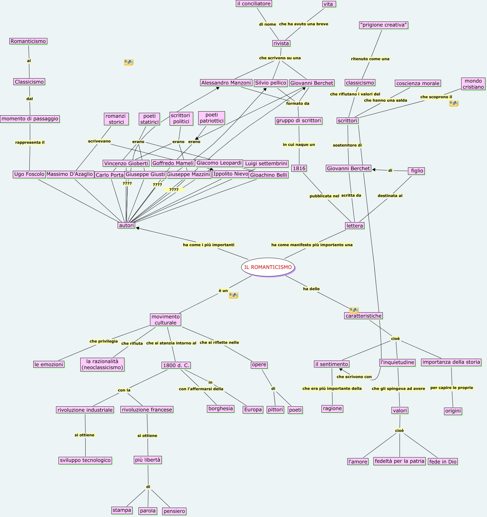 Questa Cmap, creata con IHMC CmapTools, contiene informazioni relative a: il romanticismo (bettina), rivoluzione industriale si ottiene sviluppo tecnologico, autori ???? Alessandro Manzoni, momento di passaggio dal Classicismo, figlio di Giovanni Berchet, scrittori che scrivono con il sentimento, Romanticismo al Classicismo, autori ???? Vincenzo Gioberti, lettera scritta da Giovanni Berchet, scrittori che scoprono il mondo cristiano, 1800 d. C. con la rivoluzione francese, più libertà di parola, valori cioè fedeltà per la patria, Giuseppe Mazzini erano scrittori politici, autori ???? Silvio pellico, più libertà di stampa, autori ???? Goffredo Mameli, gruppo di scrittori formato da Alessandro Manzoni, valori cioè l'amore, lettera destinata al figlio, caratteristiche cioè l'inquietudine