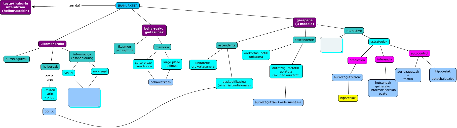 Este mapa conceptual tiene información relacionada a: IHN irakurketa, ascendente ???? unitatetik orokortasunera, descendente ???? aurrezagutzetatik abiatuta irakurlea aurreratu, memoria ???? largo plazo jakintza, interactivo ???? , ulermenerako ???? aurrezagutzak, IRAKURKETA ???? ulermenerako, ascendente ???? deskodifikazioa (oinarria tradizionala), aurrezagutzetatik abiatuta irakurlea aurreratu ???? aurrezagutza++=ulermena++, garapena (3 modelo) ???? descendente, - zuzen -arin - ondo ???? porrot