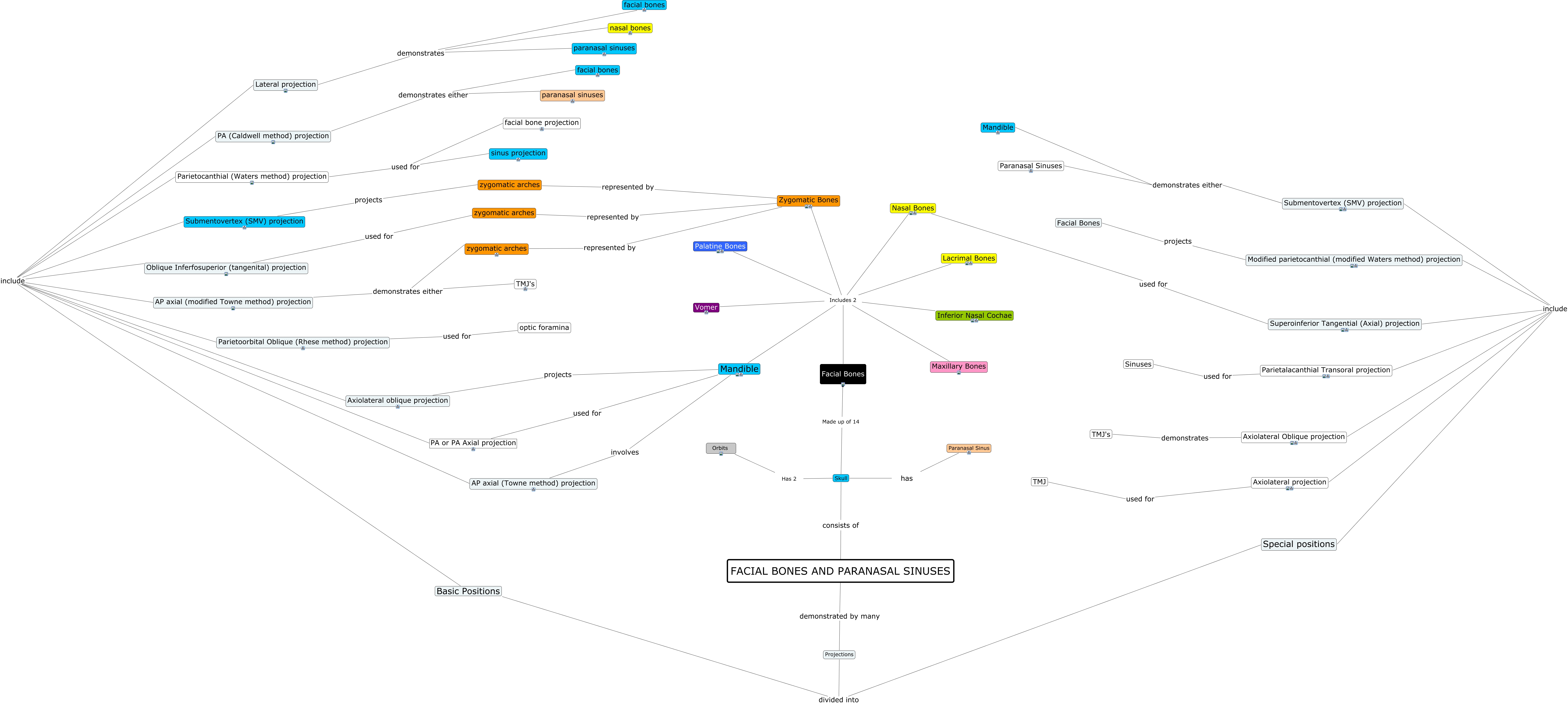 This Concept Map, created with IHMC CmapTools, has information related to: ___Project 2 - CMAP - Lindsey Siddens and Shannon Smith - Facial Bones and Parasinuses, Special positions include Modified parietocanthial (modified Waters method) projection, Basic Positions include Oblique Inferfosuperior (tangenital) projection, Facial Bones Includes 2 Maxillary Bones, zygomatic arches represented by Zygomatic Bones, Oblique Inferfosuperior (tangenital) projection used for zygomatic arches, Projections divided into Basic Positions, Axiolateral projection used for TMJ, Mandible involves AP axial (Towne method) projection, Submentovertex (SMV) projection demonstrates either Mandible, Skull has Paranasal Sinus, Basic Positions include Axiolateral oblique projection, Projections divided into Special positions, Axiolateral oblique projection projects Mandible, Basic Positions include AP axial (modified Towne method) projection, Mandible Includes 2 Nasal Bones, Facial Bones Includes 2 Vomer, Lateral projection demonstrates nasal bones, Parietalacanthial Transoral projection used for Sinuses, Facial Bones Includes 2 Inferior Nasal Cochae, Mandible Includes 2 Inferior Nasal Cochae