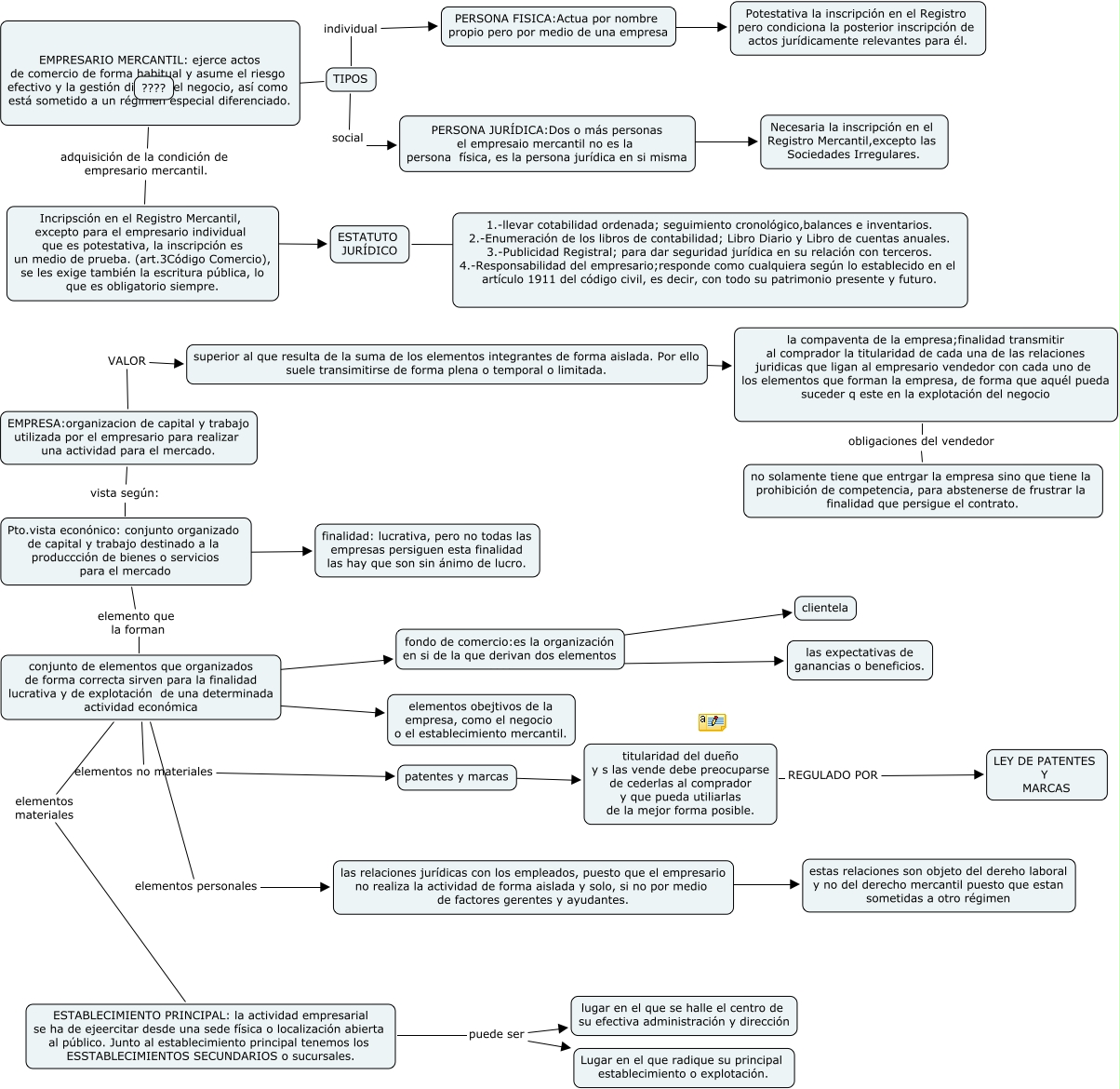 Este Cmap, tiene información relacionada con: Sin Título 1, conjunto de elementos que organizados de forma correcta sirven para la finalidad lucrativa y de explotación de una determinada actividad económica ???? fondo de comercio:es la organización en si de la que derivan dos elementos, ESTATUTO JURÍDICO ???? 1.-llevar cotabilidad ordenada; seguimiento cronológico,balances e inventarios. 2.-Enumeración de los libros de contabilidad; Libro Diario y Libro de cuentas anuales. 3.-Publicidad Registral; para dar seguridad jurídica en su relación con terceros. 4.-Responsabilidad del empresario;responde como cualquiera según lo establecido en el artículo 1911 del código civil, es decir, con todo su patrimonio presente y futuro., superior al que resulta de la suma de los elementos integrantes de forma aislada. Por ello suele transimitirse de forma plena o temporal o limitada. ???? la compaventa de la empresa;finalidad transmitir al comprador la titularidad de cada una de las relaciones juridicas que ligan al empresario vendedor con cada uno de los elementos que forman la empresa, de forma que aquél pueda suceder q este en la explotación del negocio, EMPRESARIO MERCANTIL: ejerce actos de comercio de forma habitual y asume el riesgo efectivo y la gestión directa del negocio, así como está sometido a un régimen especial diferenciado. adquisición de la condición de empresario mercantil. Incripsción en el Registro Mercantil, excepto para el empresario individual que es potestativa, la inscripción es un medio de prueba. (art.3Código Comercio), se les exige también la escritura pública, lo que es obligatorio siempre., Pto.vista econónico: conjunto organizado de capital y trabajo destinado a la produccción de bienes o servicios para el mercado ???? finalidad: lucrativa, pero no todas las empresas persiguen esta finalidad las hay que son sin ánimo de lucro., EMPRESA:organizacion de capital y trabajo utilizada por el empresario para realizar una actividad para el mercado. vista según: Pto.vista econónico: conjunto organizado de capital y trabajo destinado a la produccción de bienes o servicios para el mercado, fondo de comercio:es la organización en si de la que derivan dos elementos ???? las expectativas de ganancias o beneficios., TIPOS ???? EMPRESARIO MERCANTIL: ejerce actos de comercio de forma habitual y asume el riesgo efectivo y la gestión directa del negocio, así como está sometido a un régimen especial diferenciado., ESTABLECIMIENTO PRINCIPAL: la actividad empresarial se ha de ejeercitar desde una sede física o localización abierta al público. Junto al establecimiento principal tenemos los ESSTABLECIMIENTOS SECUNDARIOS o sucursales. puede ser lugar en el que se halle el centro de su efectiva administración y dirección, PERSONA FISICA:Actua por nombre propio pero por medio de una empresa ???? Potestativa la inscripción en el Registro pero condiciona la posterior inscripción de actos jurídicamente relevantes para él., fondo de comercio:es la organización en si de la que derivan dos elementos ???? clientela, TIPOS individual PERSONA FISICA:Actua por nombre propio pero por medio de una empresa, patentes y marcas ???? titularidad del dueño y s las vende debe preocuparse de cederlas al comprador y que pueda utiliarlas de la mejor forma posible., la compaventa de la empresa;finalidad transmitir al comprador la titularidad de cada una de las relaciones juridicas que ligan al empresario vendedor con cada uno de los elementos que forman la empresa, de forma que aquél pueda suceder q este en la explotación del negocio obligaciones del vendedor no solamente tiene que entrgar la empresa sino que tiene la prohibición de competencia, para abstenerse de frustrar la finalidad que persigue el contrato., conjunto de elementos que organizados de forma correcta sirven para la finalidad lucrativa y de explotación de una determinada actividad económica elementos no materiales patentes y marcas, Pto.vista econónico: conjunto organizado de capital y trabajo destinado a la produccción de bienes o servicios para el mercado elemento que la forman conjunto de elementos que organizados de forma correcta sirven para la finalidad lucrativa y de explotación de una determinada actividad económica, las relaciones jurídicas con los empleados, puesto que el empresario no realiza la actividad de forma aislada y solo, si no por medio de factores gerentes y ayudantes. ???? estas relaciones son objeto del dereho laboral y no del derecho mercantil puesto que estan sometidas a otro régimen, conjunto de elementos que organizados de forma correcta sirven para la finalidad lucrativa y de explotación de una determinada actividad económica ???? elementos obejtivos de la empresa, como el negocio o el establecimiento mercantil., titularidad del dueño y s las vende debe preocuparse de cederlas al comprador y que pueda utiliarlas de la mejor forma posible. REGULADO POR LEY DE PATENTES Y MARCAS, Incripsción en el Registro Mercantil, excepto para el empresario individual que es potestativa, la inscripción es un medio de prueba. (art.3Código Comercio), se les exige también la escritura pública, lo que es obligatorio siempre. ???? ESTATUTO JURÍDICO