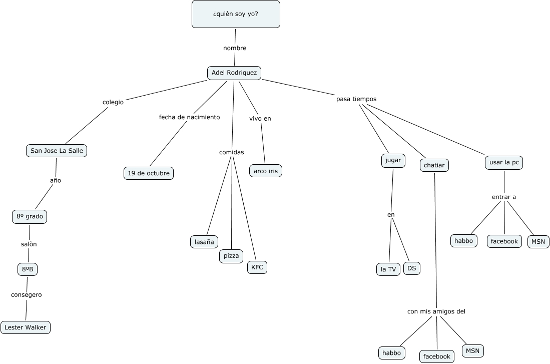 Este Cmap, tiene información relacionada con: biografia, usar la pc entrar a MSN, Adel Rodriquez colegio San Jose La Salle, ¿quièn soy yo? nombre Adel Rodriquez, Adel Rodriquez fecha de nacimiento 19 de octubre, Adel Rodriquez comidas KFC, Adel Rodriquez pasa tiempos usar la pc, chatiar con mis amigos del MSN, jugar en DS, chatiar con mis amigos del habbo, Adel Rodriquez comidas lasaña, Adel Rodriquez vivo en arco iris, 8º grado salòn 8ºB, San Jose La Salle año 8º grado, usar la pc entrar a facebook, chatiar con mis amigos del facebook, jugar en la TV, Adel Rodriquez comidas pizza, usar la pc entrar a habbo, Adel Rodriquez pasa tiempos chatiar, Adel Rodriquez pasa tiempos jugar