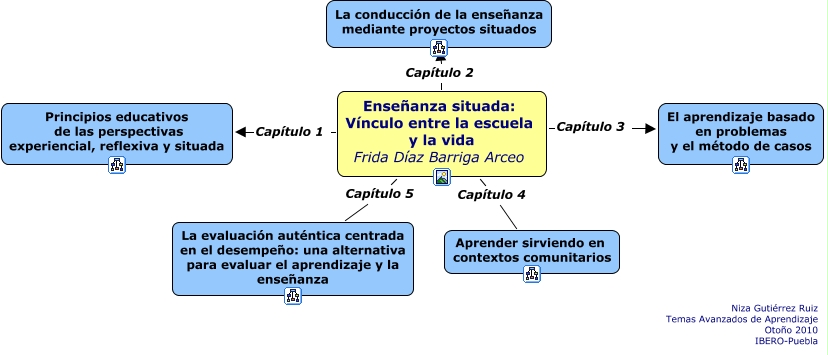 This Concept Map, created with IHMC CmapTools, has information related to: Enseñanza situada-vinculo entre la escuela y la vida, Enseñanza situada: Vínculo entre la escuela y la vida Frida Díaz Barriga Arceo Capítulo 3 El aprendizaje basado en problemas y el método de casos, Enseñanza situada: Vínculo entre la escuela y la vida Frida Díaz Barriga Arceo Capítulo 1 Principios educativos de las perspectivas experiencial, reflexiva y situada, Enseñanza situada: Vínculo entre la escuela y la vida Frida Díaz Barriga Arceo Capítulo 2 La conducción de la enseñanza mediante proyectos situados, Enseñanza situada: Vínculo entre la escuela y la vida Frida Díaz Barriga Arceo Capítulo 4 Aprender sirviendo en contextos comunitarios, Enseñanza situada: Vínculo entre la escuela y la vida Frida Díaz Barriga Arceo Capítulo 5 La evaluación auténtica centrada en el desempeño: una alternativa para evaluar el aprendizaje y la enseñanza