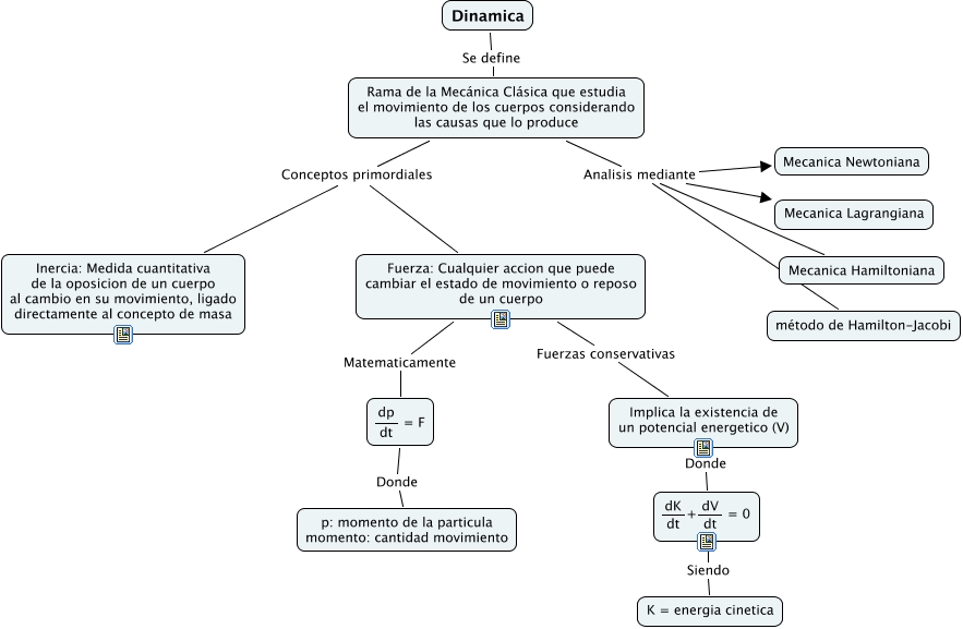 Este Cmap, tiene información relacionada con: Dinamica introducción, Rama de la Mecánica Clásica que estudia el movimiento de los cuerpos considerando las causas que lo produce Analisis mediante método de Hamilton-Jacobi, Dinamica Se define Rama de la Mecánica Clásica que estudia el movimiento de los cuerpos considerando las causas que lo produce, Rama de la Mecánica Clásica que estudia el movimiento de los cuerpos considerando las causas que lo produce Conceptos primordiales Fuerza: Cualquier accion que puede cambiar el estado de movimiento o reposo de un cuerpo, Rama de la Mecánica Clásica que estudia el movimiento de los cuerpos considerando las causas que lo produce Conceptos primordiales Inercia: Medida cuantitativa de la oposicion de un cuerpo al cambio en su movimiento, ligado directamente al concepto de masa, <math xmlns="http://www.w3.org/1998/Math/MathML"> <mrow> <mfrac> <mtext> dK </mtext> <mtext> dt </mtext> </mfrac> <mtext> + </mtext> <mfrac> <mtext> dV </mtext> <mtext> dt </mtext> </mfrac> <mtext> = 0 </mtext> </mrow> </math> Siendo K = energia cinetica, Fuerza: Cualquier accion que puede cambiar el estado de movimiento o reposo de un cuerpo Fuerzas conservativas Implica la existencia de un potencial energetico (V), Rama de la Mecánica Clásica que estudia el movimiento de los cuerpos considerando las causas que lo produce Analisis mediante Mecanica Lagrangiana, <math xmlns="http://www.w3.org/1998/Math/MathML"> <mrow> <mfrac> <mtext> dp </mtext> <mtext> dt </mtext> </mfrac> <mtext> = F </mtext> </mrow> </math> Donde p: momento de la particula momento: cantidad movimiento, Fuerza: Cualquier accion que puede cambiar el estado de movimiento o reposo de un cuerpo Matematicamente <math xmlns="http://www.w3.org/1998/Math/MathML"> <mrow> <mfrac> <mtext> dp </mtext> <mtext> dt </mtext> </mfrac> <mtext> = F </mtext> </mrow> </math>, Implica la existencia de un potencial energetico (V) Donde <math xmlns="http://www.w3.org/1998/Math/MathML"> <mrow> <mfrac> <mtext> dK </mtext> <mtext> dt </mtext> </mfrac> <mtext> + </mtext> <mfrac> <mtext> dV </mtext> <mtext> dt </mtext> </mfrac> <mtext> = 0 </mtext> </mrow> </math>, Rama de la Mecánica Clásica que estudia el movimiento de los cuerpos considerando las causas que lo produce Analisis mediante Mecanica Newtoniana, Rama de la Mecánica Clásica que estudia el movimiento de los cuerpos considerando las causas que lo produce Analisis mediante Mecanica Hamiltoniana