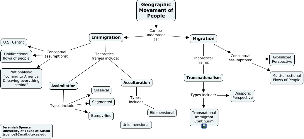 This Concept Map, created with IHMC CmapTools, has information related to: geographic movement of people, Immigration Theoretical frames include: Assimilation, Transnationalism Types include: Diasporic Perspective, Assimilation Types include: Classical, Assimilation Types include: Bumpy-line, Acculturation Types include: Bidimensional, Acculturation Types include: Unidimensional, Immigration Conceptual assumptions: Unidirectional flows of people, Transnationalism Types include: Transnational Immigrant Continuum, Geographic Movement of People Can be understood as: Immigration, Migration Theoretical frame: Transnationalism, Immigration Conceptual assumptions: U.S. Centric, Migration Conceptual assumptions: Globalized Perspective, Immigration Conceptual assumptions: Nationalistic "coming to America & leaving everything behind", Geographic Movement of People Can be understood as: Migration, Assimilation Types include: Segmented, Immigration Theoretical frames include: Acculturation, Migration Conceptual assumptions: Multi-directional Flows of People