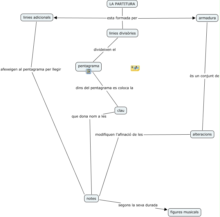 Este Cmap, tiene información relacionada con: LA PARTITURA, pentagrama dins del pentagrama es coloca la clau, linies adicionals afexeigen al pentagrama per llegir notes, armadura ès un conjunt de alteracions, LA PARTITURA esta formada per linies divisòries, alteracions modifiquen l'afinació de les notes, LA PARTITURA esta formada per linies adicionals, linies divisòries divideixen el pentagrama, clau que dona nom a les notes, notes segons la seva durada figures musicals, LA PARTITURA esta formada per armadura