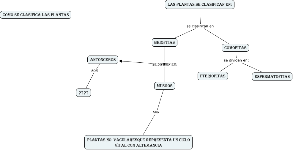 Este Cmap, tiene información relacionada con: biografìa JS, comofitas se dividen en: espermatofitas, briofitas se dividen en: musgos, antonceros son ????, las plantas se clasifican en: se clasifican en comofitas, musgos son plantas no vacularesque representa un ciclo vital con altemancia, comofitas se dividen en: pteriofitas, las plantas se clasifican en: se clasifican en briofitas, briofitas se dividen en: antonceros