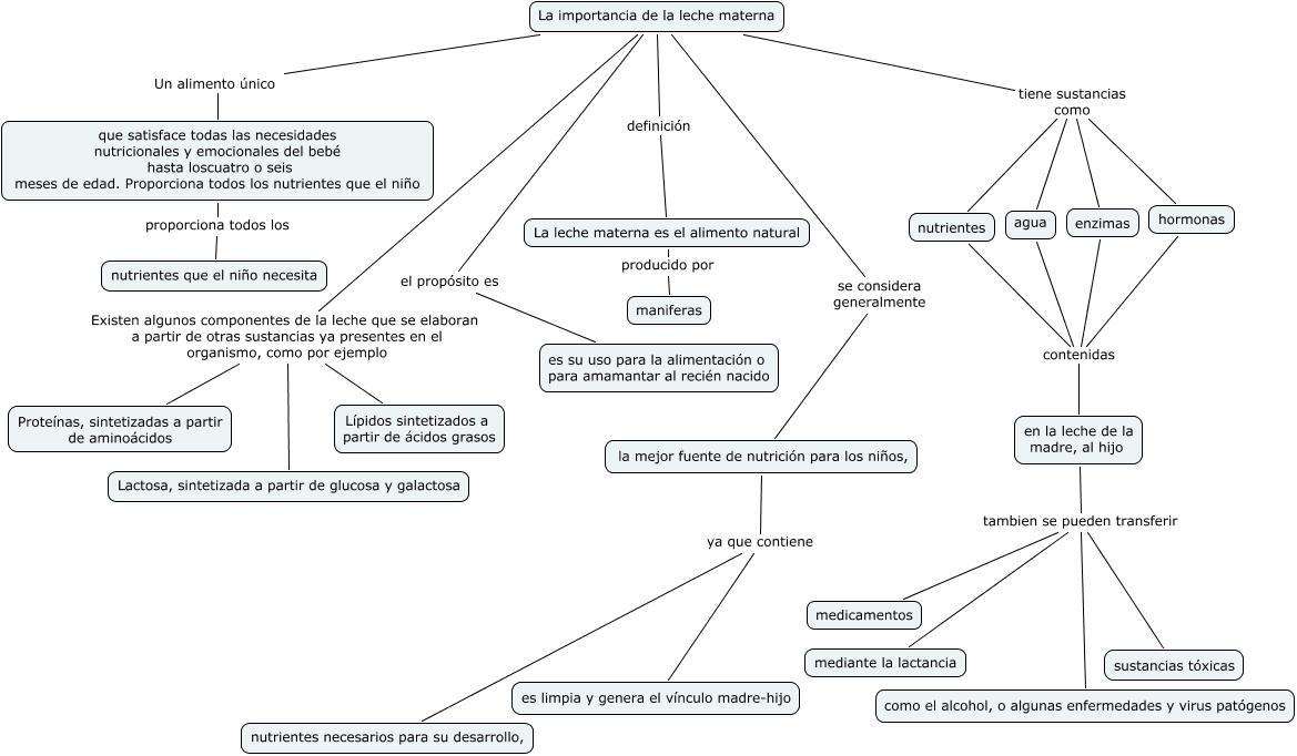 Este Cmap, tiene información relacionada con: la leche materna, que satisface todas las necesidades nutricionales y emocionales del bebé hasta loscuatro o seis meses de edad. Proporciona todos los nutrientes que el niño proporciona todos los nutrientes que el niño necesita, nutrientes contenidas en la leche de la madre, al hijo, La importancia de la leche materna tiene sustancias como nutrientes, La importancia de la leche materna Existen algunos componentes de la leche que se elaboran a partir de otras sustancias ya presentes en el organismo, como por ejemplo Lactosa, sintetizada a partir de glucosa y galactosa, La importancia de la leche materna Un alimento único que satisface todas las necesidades nutricionales y emocionales del bebé hasta loscuatro o seis meses de edad. Proporciona todos los nutrientes que el niño, hormonas contenidas en la leche de la madre, al hijo, La leche materna es el alimento natural producido por maniferas, La importancia de la leche materna tiene sustancias como hormonas, la mejor fuente de nutrición para los niños, ya que contiene nutrientes necesarios para su desarrollo,, La importancia de la leche materna definición La leche materna es el alimento natural, La importancia de la leche materna se considera generalmente la mejor fuente de nutrición para los niños,, en la leche de la madre, al hijo tambien se pueden transferir sustancias tóxicas, enzimas contenidas en la leche de la madre, al hijo, la mejor fuente de nutrición para los niños, ya que contiene es limpia y genera el vínculo madre-hijo, en la leche de la madre, al hijo tambien se pueden transferir medicamentos, La importancia de la leche materna Existen algunos componentes de la leche que se elaboran a partir de otras sustancias ya presentes en el organismo, como por ejemplo Proteínas, sintetizadas a partir de aminoácidos, La importancia de la leche materna Existen algunos componentes de la leche que se elaboran a partir de otras sustancias ya presentes en el organismo, como por ejemplo Lípidos sintetizados a partir de ácidos grasos, La importancia de la leche materna tiene sustancias como enzimas, en la leche de la madre, al hijo tambien se pueden transferir como el alcohol, o algunas enfermedades y virus patógenos, La importancia de la leche materna tiene sustancias como agua