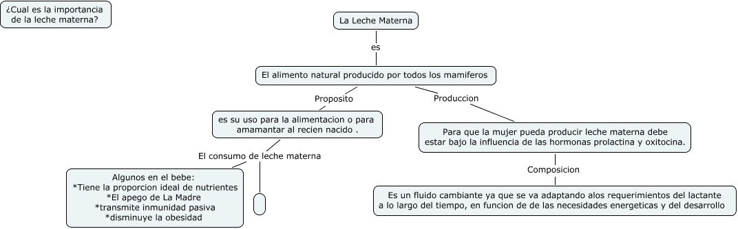 Este Cmap, tiene información relacionada con: Leche materna, es su uso para la alimentacion o para amamantar al recien nacido . El consumo de leche materna Algunos en el bebe: *Tiene la proporcion ideal de nutrientes *El apego de La Madre *transmite inmunidad pasiva *disminuye la obesidad, es su uso para la alimentacion o para amamantar al recien nacido . El consumo de leche materna, Para que la mujer pueda producir leche materna debe estar bajo la influencia de las hormonas prolactina y oxitocina. Composicion Es un fluido cambiante ya que se va adaptando alos requerimientos del lactante a lo largo del tiempo, en funcion de de las necesidades energeticas y del desarrollo, El alimento natural producido por todos los mamiferos Produccion Para que la mujer pueda producir leche materna debe estar bajo la influencia de las hormonas prolactina y oxitocina., La Leche Materna es El alimento natural producido por todos los mamiferos, El alimento natural producido por todos los mamiferos Proposito es su uso para la alimentacion o para amamantar al recien nacido .