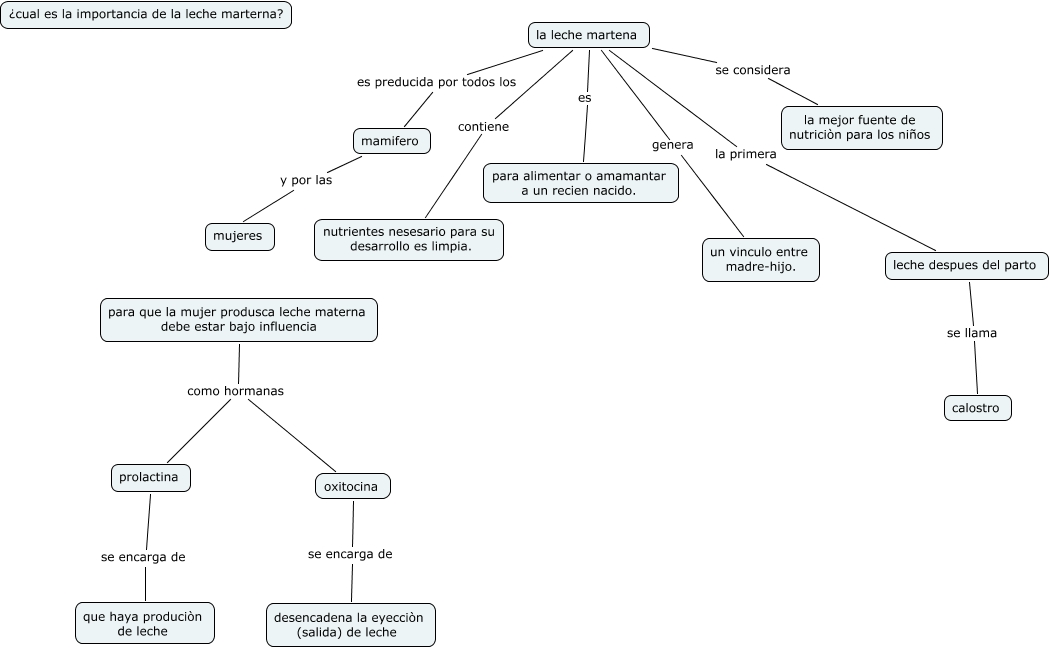 Este Cmap, tiene información relacionada con: la leche materna 7B, mamifero y por las mujeres, la leche martena la primera leche despues del parto, para que la mujer produsca leche materna debe estar bajo influencia como hormanas oxitocina, para que la mujer produsca leche materna debe estar bajo influencia como hormanas prolactina, leche despues del parto se llama calostro, prolactina se encarga de que haya produciòn de leche, la leche martena genera un vinculo entre madre-hijo., la leche martena es para alimentar o amamantar a un recien nacido., oxitocina se encarga de desencadena la eyecciòn (salida) de leche, la leche martena es preducida por todos los mamifero, la leche martena contiene nutrientes nesesario para su desarrollo es limpia., la leche martena se considera la mejor fuente de nutriciòn para los niños
