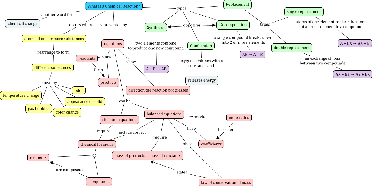 This Concept Map, created with IHMC CmapTools, has information related to: Making Sense of Chemical Reactions, equations can be balanced equations, balanced equations require mass of products = mass of reactants, Synthesis two elements combine to produce one new compound A + B → AB, chemical formulas of elements, different substances shown by temperature change, Replacement types double replacement, What is a Chemical Reaction? types Synthesis, What is a Chemical Reaction? occurs when atoms of one or more substances, What is a Chemical Reaction? types Combustion, single replacement atoms of one element replace the atoms of another element in a compound A + BX → AX + B, equations show reactants, mole ratios based on coefficients, Decomposition a single compound breaks down into 2 or more elements AB → A + B, equations show direction the reaction progresses, atoms of one or more substances rearrange to form different substances, What is a Chemical Reaction? represented by equations, skeleton equations require chemical formulas, What is a Chemical Reaction? another word for chemical change, What is a Chemical Reaction? types Replacement, reactants form products