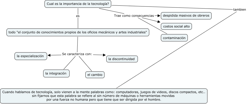 Este Cmap, tiene información relacionada con: Tecnologia 8C, Cual es la importancia de la tecnología? Trae como consecuencias despidida masivos de obreros, Cual es la importancia de la tecnología? tambien Cuando hablamos de tecnología, solo vienen a la mente palabras como: computadoras, juegos de videos, discos compactos, etc.. sin fijarnos que esta palabra se refiere al sin número de máquinas o herramientas movidas por una fuerza no humana pero que tiene que ser dirigida por el hombre., Cual es la importancia de la tecnología? es todo "el conjunto de conocimientos propios de los oficios mecánicos y artes industriales", todo "el conjunto de conocimientos propios de los oficios mecánicos y artes industriales" Se caracteriza con: la integración, Cual es la importancia de la tecnología? Trae como consecuencias contaminación, Cual es la importancia de la tecnología? Trae como consecuencias costos social alto, todo "el conjunto de conocimientos propios de los oficios mecánicos y artes industriales" Se caracteriza con: la discontinuidad, todo "el conjunto de conocimientos propios de los oficios mecánicos y artes industriales" Se caracteriza con: el cambio, todo "el conjunto de conocimientos propios de los oficios mecánicos y artes industriales" Se caracteriza con: la especialización