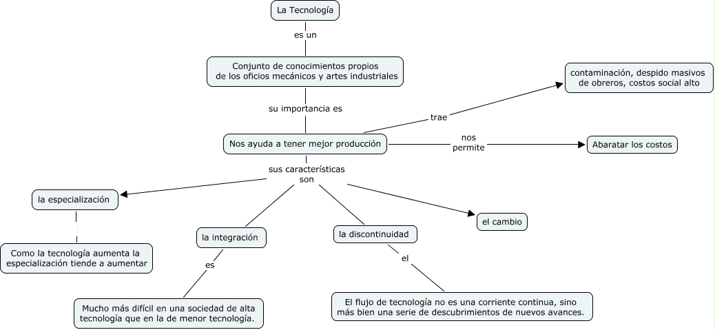 Este Cmap, tiene información relacionada con: Técnología 8º C, la integración es Mucho más difícil en una sociedad de alta tecnología que en la de menor tecnología., Conjunto de conocimientos propios de los oficios mecánicos y artes industriales su importancia es Nos ayuda a tener mejor producción, Nos ayuda a tener mejor producción sus características son el cambio, Nos ayuda a tener mejor producción trae contaminación, despido masivos de obreros, costos social alto, Nos ayuda a tener mejor producción sus características son la discontinuidad, Nos ayuda a tener mejor producción sus características son la especialización, la discontinuidad el El flujo de tecnología no es una corriente continua, sino más bien una serie de descubrimientos de nuevos avances., Nos ayuda a tener mejor producción sus características son la integración, la especialización Como la tecnología aumenta la especialización tiende a aumentar, Nos ayuda a tener mejor producción nos permite Abaratar los costos, La Tecnología es un Conjunto de conocimientos propios de los oficios mecánicos y artes industriales
