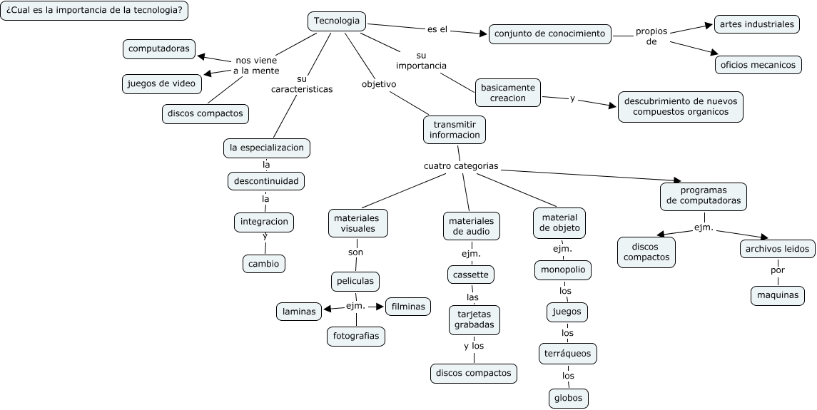 Este Cmap, tiene información relacionada con: Tecnologia 8.C, descontinuidad la integracion, transmitir informacion cuatro categorias material de objeto, conjunto de conocimiento propios de oficios mecanicos, materiales de audio ejm. cassette, basicamente creacion y descubrimiento de nuevos compuestos organicos, programas de computadoras ejm. archivos leidos, Tecnologia es el conjunto de conocimiento, tarjetas grabadas y los discos compactos, materiales visuales son peliculas, integracion y cambio, Tecnologia nos viene a la mente computadoras, transmitir informacion cuatro categorias programas de computadoras, transmitir informacion cuatro categorias materiales visuales, Tecnologia su importancia basicamente creacion, la especializacion la descontinuidad, archivos leidos por maquinas, transmitir informacion cuatro categorias materiales de audio, peliculas ejm. laminas, Tecnologia nos viene a la mente discos compactos, peliculas ejm. fotografias