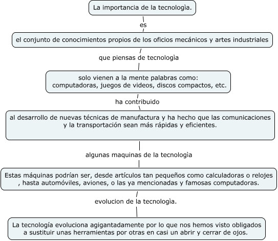 Este Cmap, tiene información relacionada con: tecnologìa 8-c, el conjunto de conocimientos propios de los oficios mecánicos y artes industriales que piensas de tecnologìa solo vienen a la mente palabras como: computadoras, juegos de videos, discos compactos, etc., solo vienen a la mente palabras como: computadoras, juegos de videos, discos compactos, etc. ha contribuido al desarrollo de nuevas técnicas de manufactura y ha hecho que las comunicaciones y la transportación sean más rápidas y eficientes., al desarrollo de nuevas técnicas de manufactura y ha hecho que las comunicaciones y la transportación sean más rápidas y eficientes. algunas maquinas de la tecnologìa Estas máquinas podrían ser, desde artículos tan pequeños como calculadoras o relojes , hasta automóviles, aviones, o las ya mencionadas y famosas computadoras., La importancia de la tecnologìa. es el conjunto de conocimientos propios de los oficios mecánicos y artes industriales, Estas máquinas podrían ser, desde artículos tan pequeños como calculadoras o relojes , hasta automóviles, aviones, o las ya mencionadas y famosas computadoras. evolucion de la tecnologìa. La tecnología evoluciona agigantadamente por lo que nos hemos visto obligados a sustituir unas herramientas por otras en casi un abrir y cerrar de ojos.