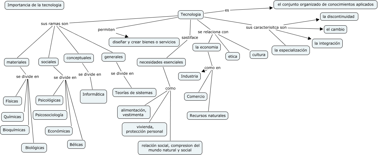 Este Cmap, tiene información relacionada con: tecnologia 8ºc, necesidades esenciales como relación social, compresion del mundo natural y social, materiales se divide en Biológicas, la economia como en Industria, materiales se divide en Químicas, materiales se divide en Físicas, necesidades esenciales como vivienda, protección personal, Tecnologia sus caracterisitca son la integración, Tecnologia sus ramas son sociales, sociales se divide en Bélicas, Tecnologia sus ramas son generales, Tecnologia sus caracterisitca son la discontinuidad, Tecnologia es el conjunto organizado de conocimientos aplicados, Tecnologia sus ramas son materiales, Tecnologia se relaciona con etica, necesidades esenciales como alimentación, vestimenta, Tecnologia permiten diseñar y crear bienes o servicios, conceptuales se divide en Informática, sociales se divide en Psicosociología, sociales se divide en Económicas, Tecnologia sus caracterisitca son el cambio