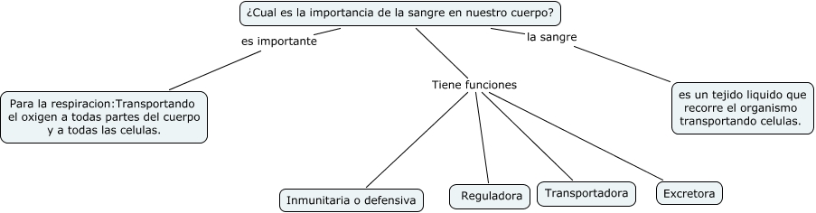 Este Cmap, tiene información relacionada con: La sangre, ¿Cual es la importancia de la sangre en nuestro cuerpo? la sangre es un tejido liquido que recorre el organismo transportando celulas., ¿Cual es la importancia de la sangre en nuestro cuerpo? Tiene funciones Transportadora, ¿Cual es la importancia de la sangre en nuestro cuerpo? Tiene funciones Reguladora, ¿Cual es la importancia de la sangre en nuestro cuerpo? Tiene funciones Inmunitaria o defensiva, ¿Cual es la importancia de la sangre en nuestro cuerpo? es importante Para la respiracion:Transportando el oxigen a todas partes del cuerpo y a todas las celulas., ¿Cual es la importancia de la sangre en nuestro cuerpo? Tiene funciones Excretora