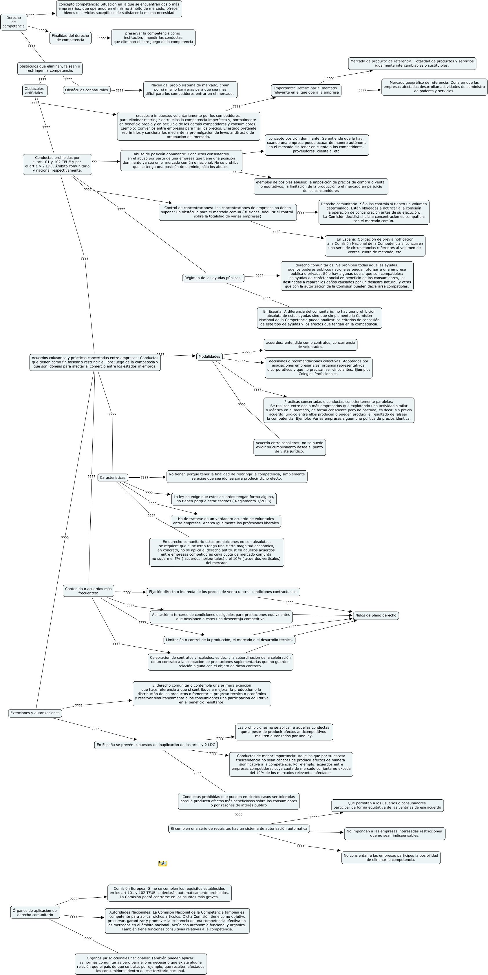 Este Cmap, tiene información relacionada con: Derecho de la competencia, Órganos de aplicación del derecho comunitario ???? Autoridades Nacionales: La Comisión Nacional de la Competencia también es competente para aplicar dichos artículos. Dicha Comisión tiene como objetivo preservar, garantizar y promover la existencia de una competencia efectiva en los mercados en el ámbito nacional. Actúa con autonomía funcional y orgánica. También tiene funciones consultivas relativas a la competencia., Control de concentraciones: Las concentraciones de empresas no deben suponer un obstáculo para el mercado común ( fusiones, adquirir el control sobre la totalidad de varias empresas) ???? Derecho comunitario: Sólo las controla si tienen un volumen determinado. Están obligadas a notificar a la comisión la operación de concentración antes de su ejecución. La Comisión decidirá si dicha concentración es compatible con el mercado común., Si cumplen una série de requisitos hay un sistema de autorización automática ???? Que permitan a los usuarios o consumidores participar de forma equitativa de las ventajas de ese acuerdo, Importante: Determinar el mercado relevante en el que opera la empresa ???? Mercado geográfico de referencia: Zona en que las empresas afectadas desarrollan actividades de suministro de poderes y servicios., Control de concentraciones: Las concentraciones de empresas no deben suponer un obstáculo para el mercado común ( fusiones, adquirir el control sobre la totalidad de varias empresas) ???? En España: Obligación de previa notficación a la Comisión Nacional de la Competencia si concurren una série de circunstancias referentes al volumen de ventas, cuota de mercado, etc., Órganos de aplicación del derecho comunitario ???? Comisión Europea: Si no se cumplen los requisitos establecidos en los art 101 y 102 TFUE se declarán automáticamente prohibidos. La Comisión podrá centrarse en los asuntos más graves., Acuerdos colusorios y prácticas concertadas entre empresas: Conductas que tienen como fin falsear o restringir el libre juego de la competecia y que son idóneas para afectar al comercio entre los estados miembros. ???? Contenido o acuerdos más frecuentes:, Exenciones y autorizaciones ???? En España se prevén supuestos de inaplicación de los art 1 y 2 LDC, Abuso de posición dominante: Conductas consistentes en el abuso por parte de una empresa que tiene una posición dominante ya sea en el mercado común o nacional. No se prohibe que se tenga una posición de dominio, sólo los abusos. ???? ejemplos de posibles abusos: la imposición de precios de compra o venta no equitativos, la limitación de la producción o el mercado en perjuicio de los consumidores, Si cumplen una série de requisitos hay un sistema de autorización automática ???? No consientan a las empresas partícipes la posibilidad de eliminar la competencia., Derecho de competencia ???? concepto competencia: Situación en la que se encuentran dos o más empresarios, que operando en el mismo ámbito de mercado, ofrecen bienes o servicios suceptibles de satisfacer la misma necesidad, En España se prevén supuestos de inaplicación de los art 1 y 2 LDC ???? Las prohibiciones no se aplican a aquellas conductas que a pesar de producir efectos anticompetitivos resulten autorizados por una ley., Características ???? Ha de tratarse de un verdadero acuerdo de voluntades entre empresas. Abarca igualmente las profesiones liberales, Fijación directa o indirecta de los precios de venta u otras condiciones contractuales. ???? Nulos de pleno derecho, Limitación o control de la producción, el mercado o el desarrollo técnico. ???? Nulos de pleno derecho, Contenido o acuerdos más frecuentes: ???? Aplicación a terceros de condiciones desiguales para prestaciones equivalentes que ocasionen a estos una desventaja competitiva., Contenido o acuerdos más frecuentes: ???? Celebración de contratos vinculados, es decir, la subordinación de la celebración de un contrato a la aceptación de prestaciones suplementarias que no guarden relación alguna con el objeto de dicho contrato., Derecho de competencia ???? Finalidad del derecho de competencia, Celebración de contratos vinculados, es decir, la subordinación de la celebración de un contrato a la aceptación de prestaciones suplementarias que no guarden relación alguna con el objeto de dicho contrato. ???? Nulos de pleno derecho, En España se prevén supuestos de inaplicación de los art 1 y 2 LDC ???? Conductas prohibidas que pueden en ciertos casos ser toleradas porqué producen efectos más beneficiosos sobre los consumidores o por razones de interés público