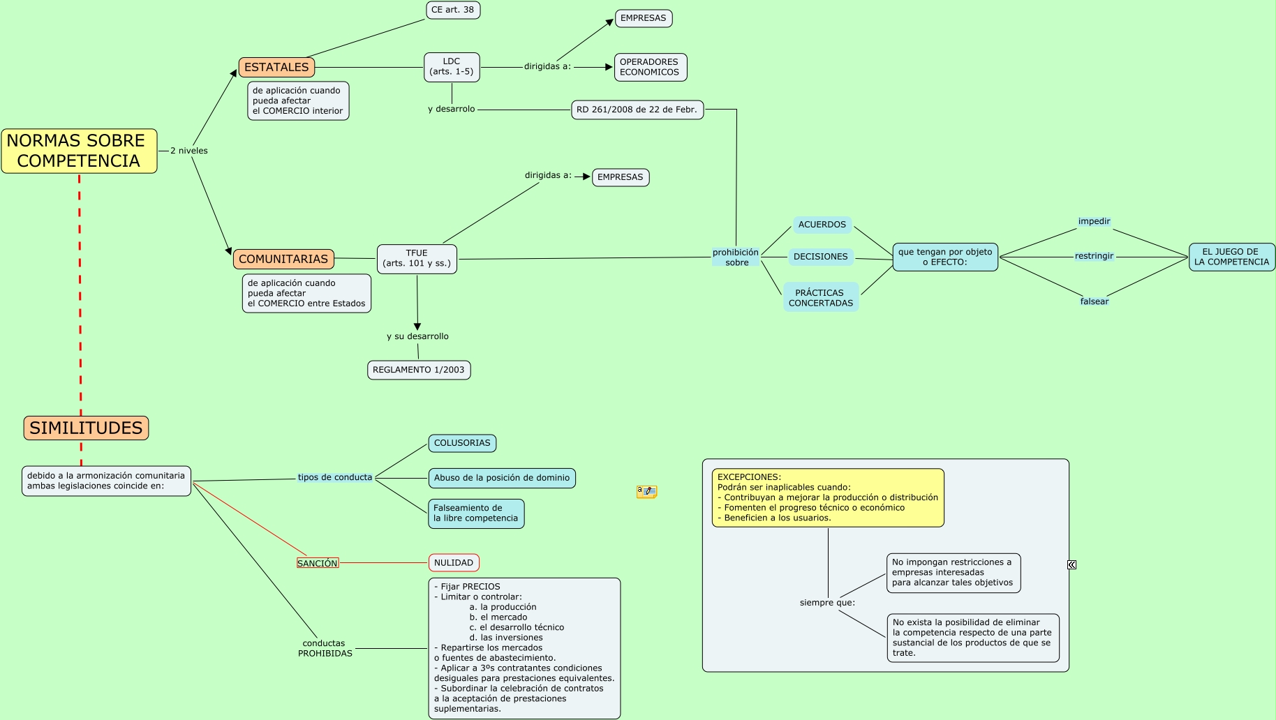 Este Cmap, tiene información relacionada con: CMAPS2- AIRLINES REBENTAPREUS, - Fijar PRECIOS - Limitar o controlar: a. la producción b. el mercado c. el desarrollo técnico d. las inversiones - Repartirse los mercados o fuentes de abastecimiento. - Aplicar a 3ºs contratantes condiciones desiguales para prestaciones equivalentes. - Subordinar la celebración de contratos a la aceptación de prestaciones suplementarias. conductas PROHIBIDAS debido a la armonización comunitaria ambas legislaciones coincide en:, EXCEPCIONES: Podrán ser inaplicables cuando: - Contribuyan a mejorar la producción o distribución - Fomenten el progreso técnico o económico - Beneficien a los usuarios. siempre que: No exista la posibilidad de eliminar la competencia respecto de una parte sustancial de los productos de que se trate., LDC (arts. 1-5) dirigidas a: EMPRESAS, debido a la armonización comunitaria ambas legislaciones coincide en: tipos de conducta Abuso de la posición de dominio, que tengan por objeto o EFECTO: restringir EL JUEGO DE LA COMPETENCIA, NORMAS SOBRE COMPETENCIA 2 niveles ESTATALES, TFUE (arts. 101 y ss.) dirigidas a: EMPRESAS, NORMAS SOBRE COMPETENCIA ???? debido a la armonización comunitaria ambas legislaciones coincide en:, TFUE (arts. 101 y ss.) prohibición sobre DECISIONES, ESTATALES ???? LDC (arts. 1-5), RD 261/2008 de 22 de Febr. prohibición sobre PRÁCTICAS CONCERTADAS, EXCEPCIONES: Podrán ser inaplicables cuando: - Contribuyan a mejorar la producción o distribución - Fomenten el progreso técnico o económico - Beneficien a los usuarios. siempre que: No impongan restricciones a empresas interesadas para alcanzar tales objetivos, que tengan por objeto o EFECTO: falsear EL JUEGO DE LA COMPETENCIA, COMUNITARIAS ???? TFUE (arts. 101 y ss.), PRÁCTICAS CONCERTADAS que tengan por objeto o EFECTO:, RD 261/2008 de 22 de Febr. prohibición sobre ACUERDOS, debido a la armonización comunitaria ambas legislaciones coincide en: SANCIÓN NULIDAD, ACUERDOS que tengan por objeto o EFECTO:, DECISIONES que tengan por objeto o EFECTO:, que tengan por objeto o EFECTO: impedir EL JUEGO DE LA COMPETENCIA