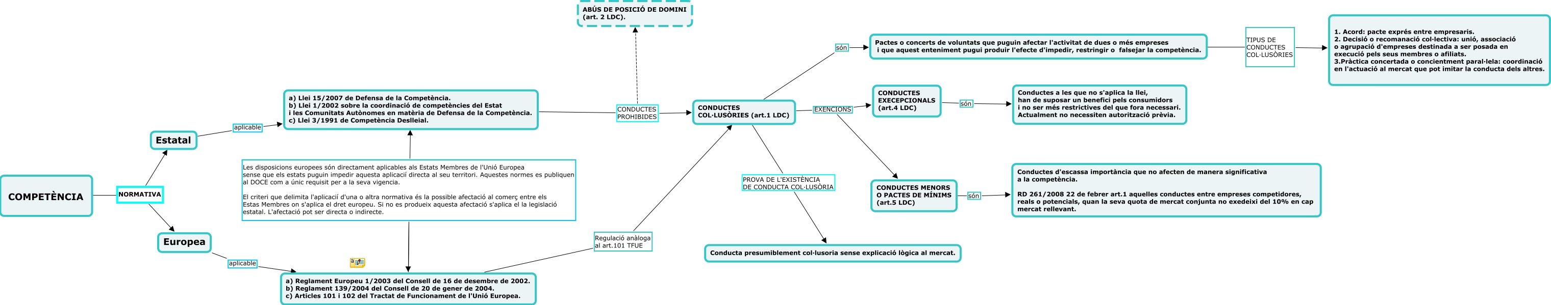 Este Cmap, tiene información relacionada con: ESCENARI 2, Europea aplicable a) Reglament Europeu 1/2003 del Consell de 16 de desembre de 2002. b) Reglament 139/2004 del Consell de 20 de gener de 2004. c) Articles 101 i 102 del Tractat de Funcionament de l'Unió Europea., Pactes o concerts de voluntats que puguin afectar l'activitat de dues o més empreses i que aquest enteniment pugui produir l'efecte d'impedir, restringir o falsejar la competència. TIPUS DE CONDUCTES COL·LUSÒRIES 1. Acord: pacte exprés entre empresaris. 2. Decisió o recomanació col·lectiva: unió, associació o agrupació d'empreses destinada a ser posada en execució pels seus membres o afiliats. 3.Pràctica concertada o concientment paral·lela: coordinació en l'actuació al mercat que pot imitar la conducta dels altres., a) Llei 15/2007 de Defensa de la Competència. b) Llei 1/2002 sobre la coordinació de competències del Estat i les Comunitats Autònomes en matèria de Defensa de la Competència. c) Llei 3/1991 de Competència Deslleial. CONDUCTES PROHIBIDES CONDUCTES COL·LUSÒRIES (art.1 LDC), CONDUCTES COL·LUSÒRIES (art.1 LDC) PROVA DE L'EXISTÈNCIA DE CONDUCTA COL·LUSÒRIA Conducta presumiblement col·lusoria sense explicació lògica al mercat., CONDUCTES COL·LUSÒRIES (art.1 LDC) EXENCIONS CONDUCTES MENORS O PACTES DE MÍNIMS (art.5 LDC), a) Reglament Europeu 1/2003 del Consell de 16 de desembre de 2002. b) Reglament 139/2004 del Consell de 20 de gener de 2004. c) Articles 101 i 102 del Tractat de Funcionament de l'Unió Europea. Les disposicions europees són directament aplicables als Estats Membres de l'Unió Europea sense que els estats puguin impedir aquesta aplicacií directa al seu territori. Aquestes normes es publiquen al DOCE com a únic requisit per a la seva vigencia. El criteri que delimita l'aplicacií d'una o altra normativa és la possible afectació al comerç entre els Estas Membres on s'aplica el dret europeu. Si no es produeix aquesta afectació s'aplica el la legislació estatal. L'afectació pot ser directa o indirecte. a) Llei 15/2007 de Defensa de la Competència. b) Llei 1/2002 sobre la coordinació de competències del Estat i les Comunitats Autònomes en matèria de Defensa de la Competència. c) Llei 3/1991 de Competència Deslleial., CONDUCTES MENORS O PACTES DE MÍNIMS (art.5 LDC) són Conductes d'escassa importància que no afecten de manera significativa a la competència. RD 261/2008 22 de febrer art.1 aquelles conductes entre empreses competidores, reals o potencials, quan la seva quota de mercat conjunta no exedeixi del 10% en cap mercat rellevant., CONDUCTES COL·LUSÒRIES (art.1 LDC) EXENCIONS CONDUCTES EXECEPCIONALS (art.4 LDC), COMPETÈNCIA NORMATIVA Europea, a) Llei 15/2007 de Defensa de la Competència. b) Llei 1/2002 sobre la coordinació de competències del Estat i les Comunitats Autònomes en matèria de Defensa de la Competència. c) Llei 3/1991 de Competència Deslleial. CONDUCTES PROHIBIDES ABÚS DE POSICIÓ DE DOMINI (art. 2 LDC)., Estatal aplicable a) Llei 15/2007 de Defensa de la Competència. b) Llei 1/2002 sobre la coordinació de competències del Estat i les Comunitats Autònomes en matèria de Defensa de la Competència. c) Llei 3/1991 de Competència Deslleial., COMPETÈNCIA NORMATIVA Estatal, CONDUCTES COL·LUSÒRIES (art.1 LDC) són Pactes o concerts de voluntats que puguin afectar l'activitat de dues o més empreses i que aquest enteniment pugui produir l'efecte d'impedir, restringir o falsejar la competència., CONDUCTES EXECEPCIONALS (art.4 LDC) són Conductes a les que no s'aplica la llei, han de suposar un benefici pels consumidors i no ser més restrictives del que fora necessari. Actualment no necessiten autorització prèvia., a) Reglament Europeu 1/2003 del Consell de 16 de desembre de 2002. b) Reglament 139/2004 del Consell de 20 de gener de 2004. c) Articles 101 i 102 del Tractat de Funcionament de l'Unió Europea. Regulació anàloga al art.101 TFUE CONDUCTES COL·LUSÒRIES (art.1 LDC)