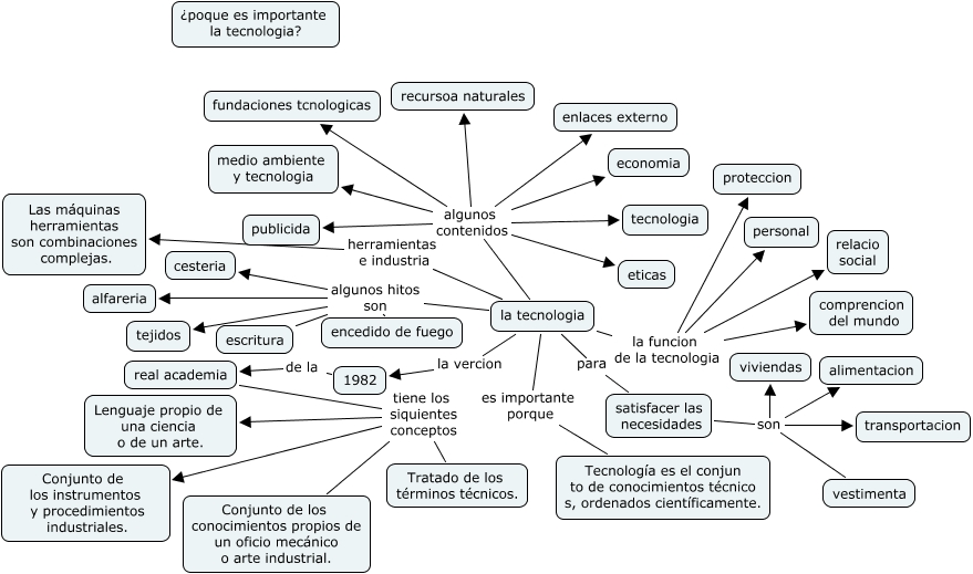 Este Cmap, tiene información relacionada con: tecnologia 8-Aa, la tecnologia es importante porque Tecnología es el conjun to de conocimientos técnico s, ordenados científicamente., satisfacer las necesidades son viviendas, satisfacer las necesidades son transportacion, la tecnologia algunos hitos son escritura, la tecnologia algunos hitos son tejidos, real academia tiene los siquientes conceptos Conjunto de los conocimientos propios de un oficio mecánico o arte industrial., 1982 de la real academia, la tecnologia algunos hitos son alfareria, la tecnologia algunos contenidos recursoa naturales, la tecnologia algunos contenidos enlaces externo, la tecnologia algunos contenidos fundaciones tcnologicas, la tecnologia algunos hitos son cesteria, la tecnologia la funcion de la tecnologia proteccion, real academia tiene los siquientes conceptos Lenguaje propio de una ciencia o de un arte., la tecnologia algunos hitos son encedido de fuego, la tecnologia algunos contenidos publicida, satisfacer las necesidades son alimentacion, la tecnologia algunos contenidos eticas, la tecnologia algunos contenidos medio ambiente y tecnologia, la tecnologia algunos contenidos tecnologia