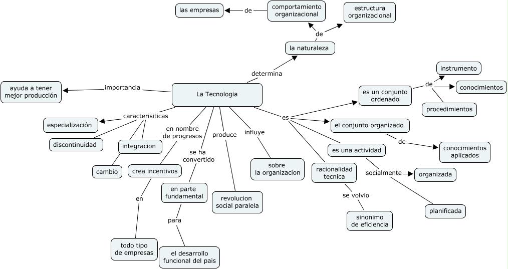Este Cmap, tiene información relacionada con: la tecnologia 8a, el conjunto organizado de conocimientos aplicados, es un conjunto ordenado de instrumento, La Tecnologia influye sobre la organizacion, La Tecnologia es racionalidad tecnica, La Tecnologia es es una actividad, la naturaleza de estructura organizacional, la naturaleza de comportamiento organizacional, La Tecnologia es el conjunto organizado, es un conjunto ordenado de procedimientos, es un conjunto ordenado de conocimientos, crea incentivos en todo tipo de empresas, La Tecnologia en nombre de progresos crea incentivos, La Tecnologia es es un conjunto ordenado, es una actividad socialmente planificada, La Tecnologia caracterisiticas especialización, racionalidad tecnica se volvio sinonimo de eficiencia, La Tecnologia caracterisiticas discontinuidad, La Tecnologia determina la naturaleza, La Tecnologia importancia ayuda a tener mejor producción, es una actividad socialmente organizada