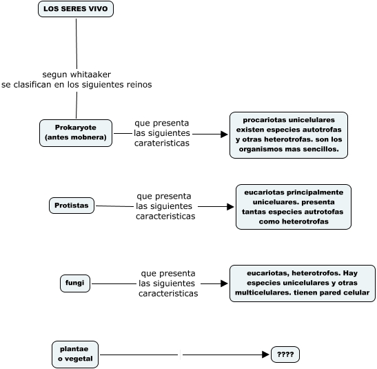 Este Cmap, tiene información relacionada con: los seres vivos, plantae o vegetal ????, fungi que presenta las siguientes caracteristicas eucariotas, heterotrofos. Hay especies unicelulares y otras multicelulares. tienen pared celular, Protistas que presenta las siguientes caracteristicas eucariotas principalmente uniceluares. presenta tantas especies autrotofas como heterotrofas, LOS SERES VIVO segun whitaaker se clasifican en los siguientes reinos Prokaryote (antes mobnera), Prokaryote (antes mobnera) que presenta las siguientes carateristicas procariotas unicelulares existen especies autotrofas y otras heterotrofas. son los organismos mas sencillos.