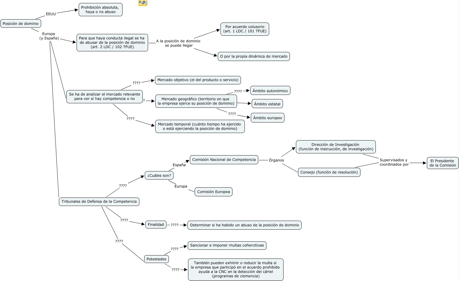 Este Cmap, tiene información relacionada con: Mapa conceptual 3 - Abuso de la posición de dominio, Para que haya conducta ilegal se ha de abusar de la posición de dominio (art. 2 LDC / 102 TFUE) A la posición de dominio se puede llegar O por la propia dinámica de mercado, ¿Cuáles son? Europa Comisión Europea, Potestades ???? También pueden exhimir o reducir la multa si la empresa que participó en el acuerdo prohibido ayuda a la CNC en la detección del cártel (programas de clemencia), Posición de dominio EEUU Prohibición absoluta, haya o no abuso, Posición de dominio Europa (y España) Tribunales de Defensa de la Competencia, Finalidad ???? Determinar si ha habido un abuso de la posición de dominio, ¿Cuáles son? España Comisión Nacional de Competencia, Tribunales de Defensa de la Competencia ???? Potestades, Se ha de analizar el mercado relevante para ver si hay competencia o no ???? Mercado geográfico (territorio en que la empresa ejerce su posición de dominio), Mercado geográfico (territorio en que la empresa ejerce su posición de dominio) ???? Ámbito estatal, Para que haya conducta ilegal se ha de abusar de la posición de dominio (art. 2 LDC / 102 TFUE) A la posición de dominio se puede llegar Por acuerdo colusorio (art. 1 LDC / 101 TFUE), Comisión Nacional de Competencia Órganos Consejo (función de resolución), Dirección de Investigación (función de instrucción, de investigación) Supervisados y coordinados por El Presidente de la Comisión, Mercado geográfico (territorio en que la empresa ejerce su posición de dominio) ???? Ámbito europeo, Potestades ???? Sancionar e imponer multas cohercitivas, Se ha de analizar el mercado relevante para ver si hay competencia o no ???? Mercado temporal (cuánto tiempo ha ejercido o está ejerciendo la posición de dominio), Posición de dominio Europa (y España) Se ha de analizar el mercado relevante para ver si hay competencia o no, Mercado geográfico (territorio en que la empresa ejerce su posición de dominio) ???? Ámbito autonómico, Posición de dominio Europa (y España) Para que haya conducta ilegal se ha de abusar de la posición de dominio (art. 2 LDC / 102 TFUE), Comisión Nacional de Competencia Órganos Dirección de Investigación (función de instrucción, de investigación)