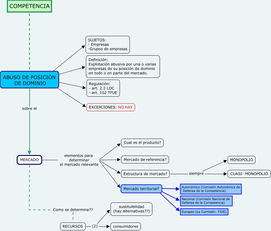 Este Cmap, tiene información relacionada con: CMAPS3- LA FIRA, MERCADO elementos para determinar el mercado relevante Mercado territorial?, RECURSOS (2) consumidores, MERCADO elementos para determinar el mercado relevante Mercado de referencia?, Mercado territorial? ???? Autonómico (Comisión Autonómica de Defensa de la Competencia), RECURSOS (2) sustituibilidad (hay alternativas??), MERCADO elementos para determinar el mercado relevante Estructura de mercado?, MERCADO Como se determina?? RECURSOS, MERCADO elementos para determinar el mercado relevante Cual es el producto?, ABUSO DE POSICIÓN DE DOMINIO ???? Regulación: - art. 2.2 LDC - art. 102 TFUE, COMPETENCIA ???? ABUSO DE POSICIÓN DE DOMINIO, ABUSO DE POSICIÓN DE DOMINIO sobre el MERCADO, Mercado territorial? ???? Europeo (La Comisión- TJUE), ABUSO DE POSICIÓN DE DOMINIO ???? SUJETOS: - Empresas -Grupos de empresas, Estructura de mercado? siempre CUASI- MONOPOLIO, Mercado territorial? ???? Nacional (Comisión Nacional de Defensa de la Competencia), ABUSO DE POSICIÓN DE DOMINIO ???? EXCEPCIONES: NO HAY, ABUSO DE POSICIÓN DE DOMINIO ???? Definición: Explotación abusiva por una o varias empresas de su posición de dominio en todo o en parte del mercado., Estructura de mercado? siempre MONOPOLIO